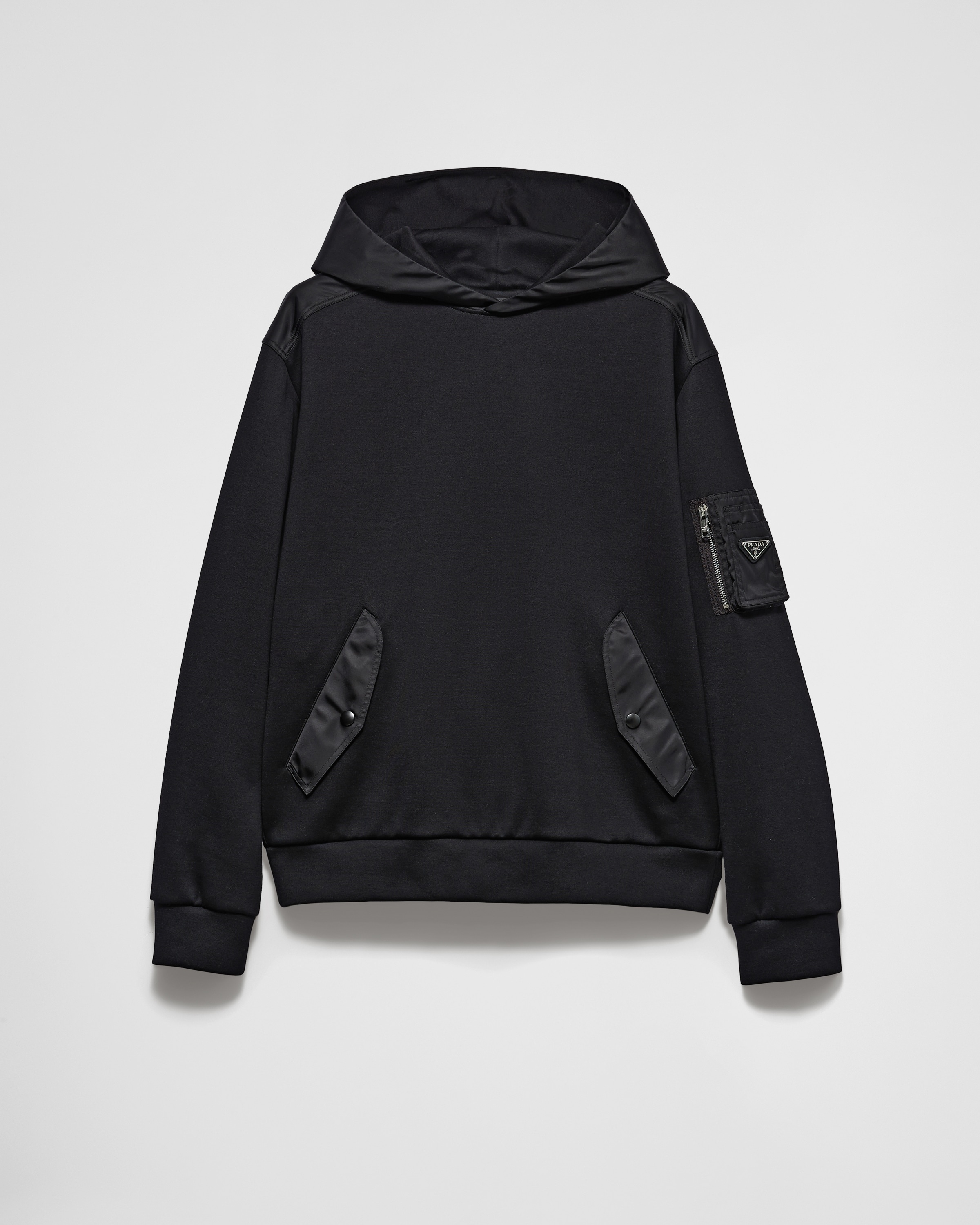 This cotton fleece hoodie with an oversized silhouette is defined by Re-Nylon details with functional style like the zipper pocket decorated with the triangle logo. - Product code: UJL04C_11JE_F0806_S_OOO - Oversized fit - Long sleeves - Attached Re-Nylon hood - Straight hem - Enameled metal triangle logo - Length: 74 cm, Size: M - Side pockets with snaps - Re-Nylon small zipper pocket - Imported - The model is 189 cm tall and wears a size 48 Height: 74cm MATERIALS Main material: 70% cotton 30% polyamide