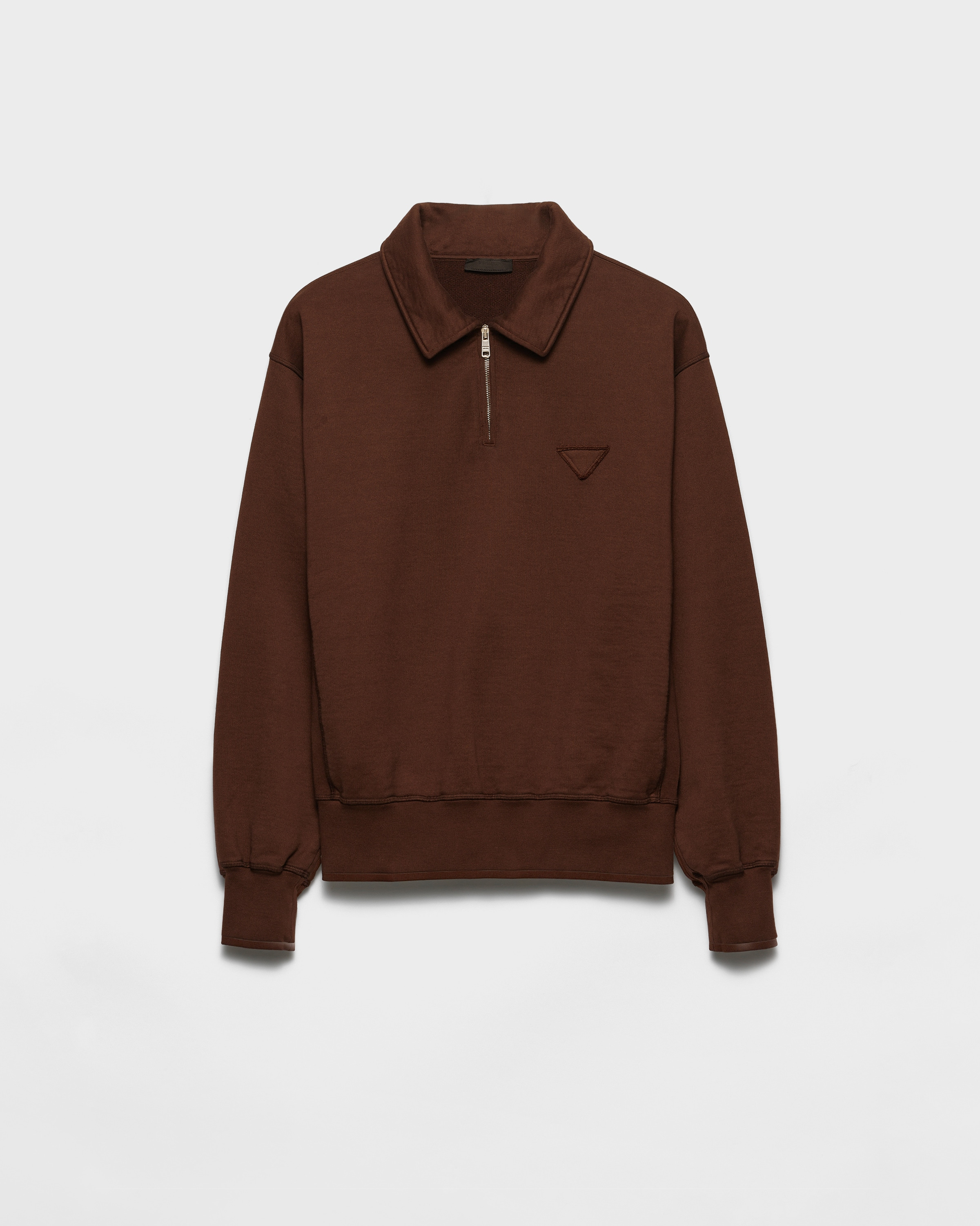 Minimalism and sport are combined in the design of this polo shirt with a contemporary and refined style. The sleek garment made of cotton fleece is decorated with the tonal triangle logo. - Product code: UJL55C_1YFT_F0324_S_OOO - Boxy fit - Long sleeves - Ribbed knit cuffs and hem - Half-zipper closure - Fabric triangle logo - Length: 68 cm, Size: M - Imported - The model is 189 cm tall and wears a size 48 Height: 68cm MATERIALS Main material: 100% cotton