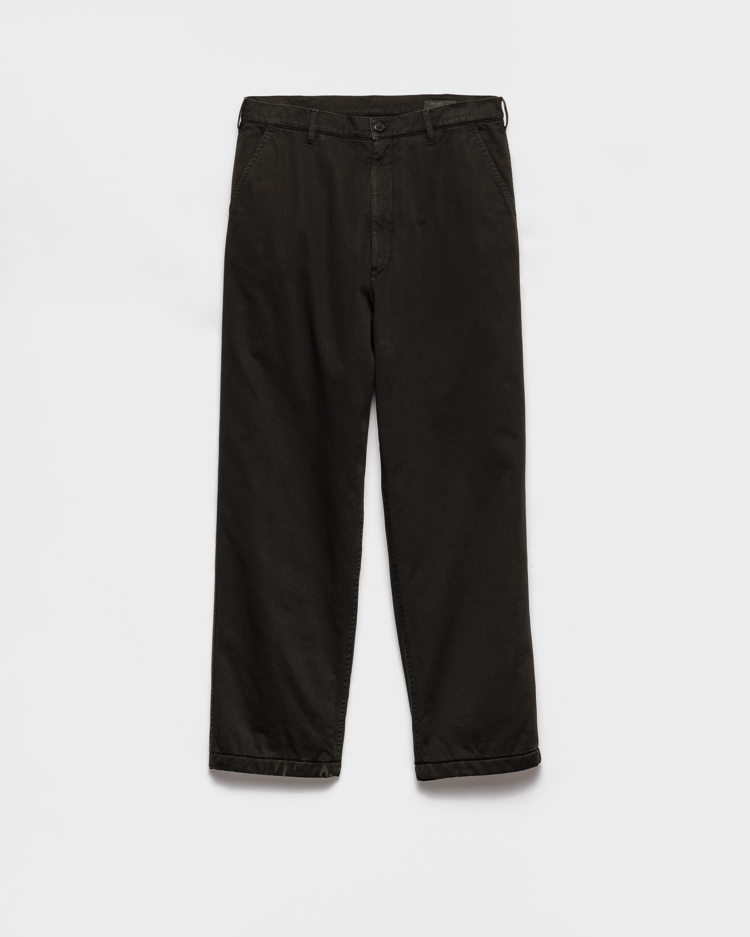These pants with a relaxed fit and wide-leg silhouette are made of cotton enriched with a vintage effect. Artisanal workmanship adds dimension to the garment with a breezy, casual style. - Product code: SPH496_16FT_F0002_S_OOO - Wide-leg fit - Zipper fly with button - Angled front slash pockets - Welt back pockets with button - Hem width: 23 cm - Fabric triangle logo on the back - Artisan treatment on the finished garment creates a deliberate vintage look - Creases and folds are an intrinsic feature made by pressing the finished garment. - Imported - The model is 189 cm tall and wears a size 48 Height: 110cm MATERIALS Main material: 100% cotton