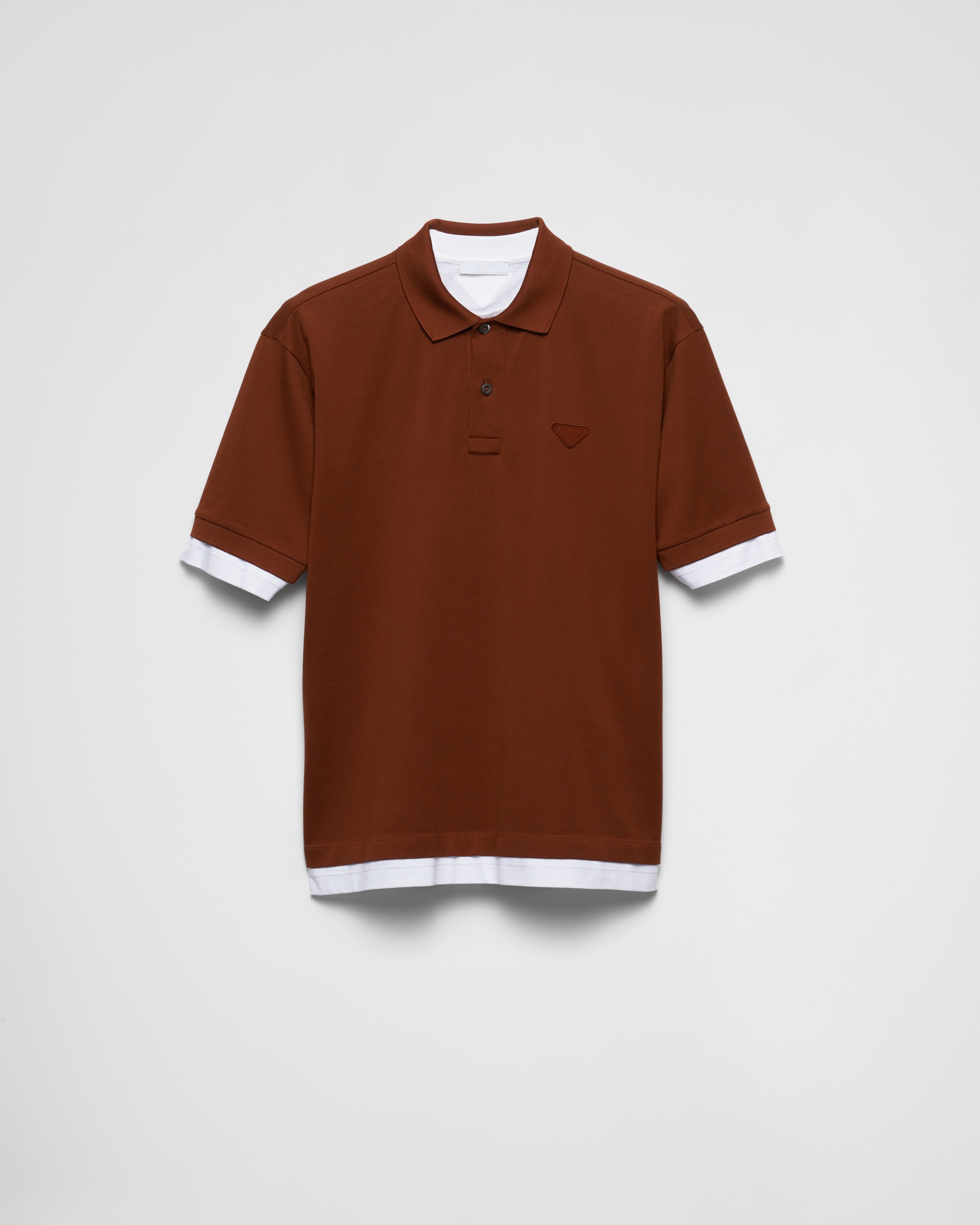 The cotton polo shirt is reinterpreted with layering that gives a classic silhouette contemporary and sporty appeal. Oversized lines define in short-sleeved style enriched with contrasting jersey trim and decorated with the emblematic fabric triangle logo. - Product code: UJN911_15DA_F0005_S_OOO - Short sleeve - Ribbed knit collar - Straight hem - Mother-of-pearl buttons - Conceptual triangle - Length 70 cm, Size M - Imported - The model is 189 cm tall and wears a size 48 Height: 70cm MATERIALS Main material: 100% cotton