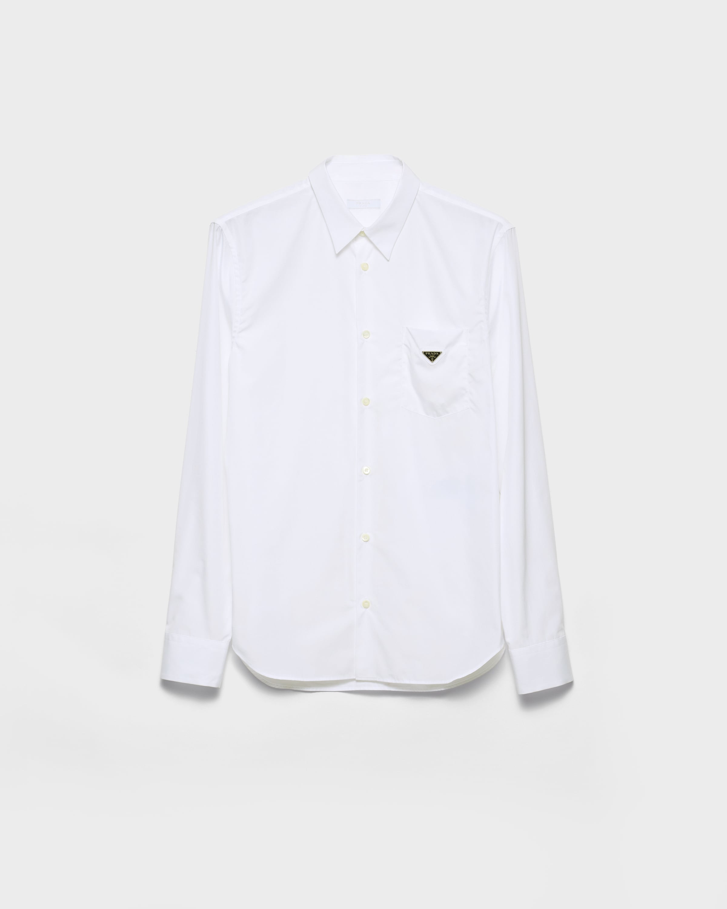 This cotton shirt with a small patch pocket on the front and rounded hem has a classic cut. The enameled metal triangle logo adds its signature touch to the versatile and refined design. - Product code: UCN631_10IV_F0009_S_OOO - Classic fit - Classic collar - Small patch pocket on the chest - Rounded hem - Classic cuff - Mother-of-pearl button closure - Enameled metal triangle logo - Imported - The model is 189 cm tall and wears a size 48 Height: 76cm MATERIALS Main material: 100% cotton