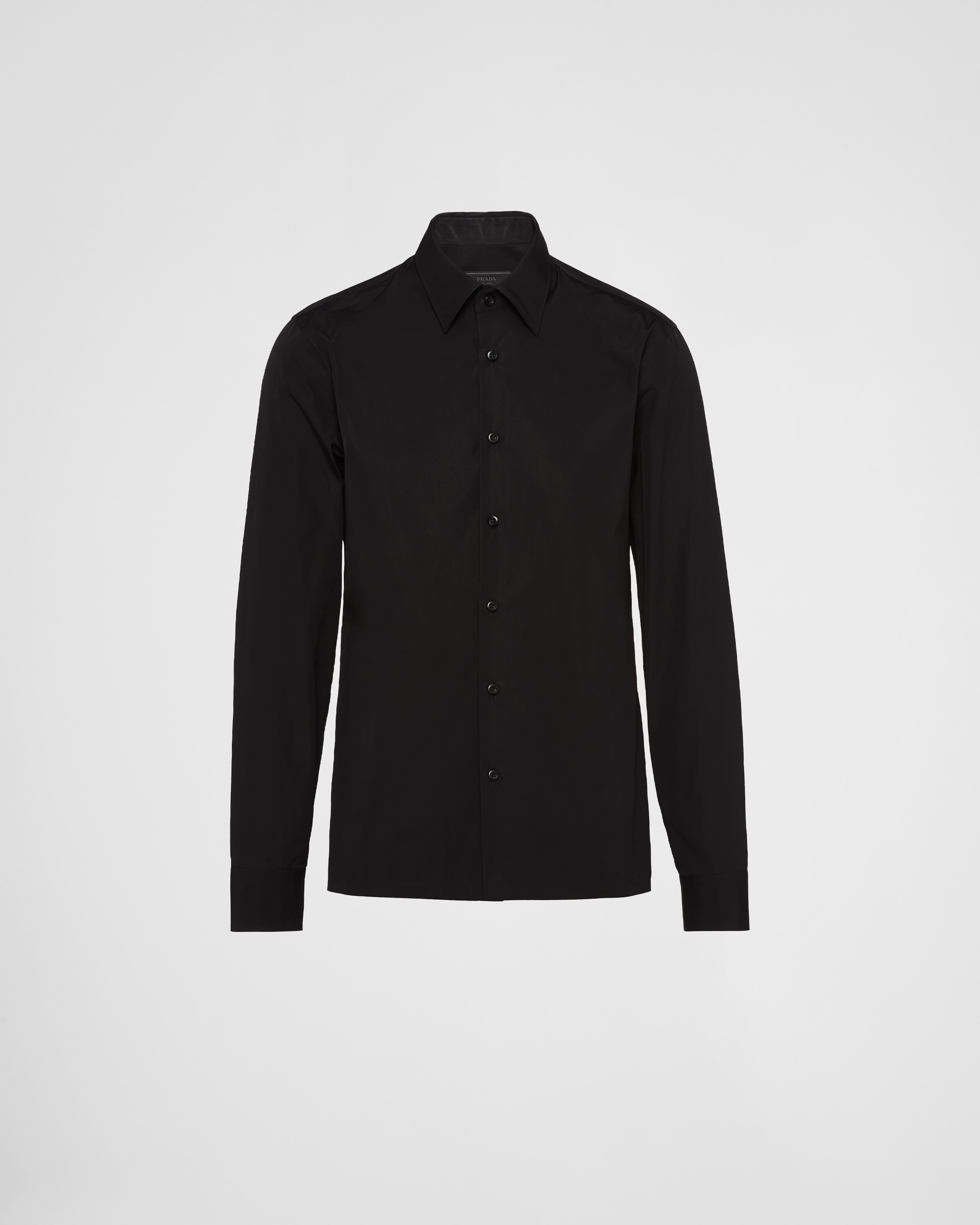This straight-cut cotton shirt offers timeless allure. Classic collar and opening with covered buttons. The fabric triangle logo patch on the back adds an original touch. - Product code: UCN482_1XV2_F0002_S_231 - Straight cut - Classic collar - Straight hem - Classic cuffs - Opening with mother-of-pearl buttons - Fabric triangle logo on back - Contrasting stitching - Imported - The model is 189 cm tall and wears a size 48 Height: 72cm MATERIALS Main material: 100% cotton
