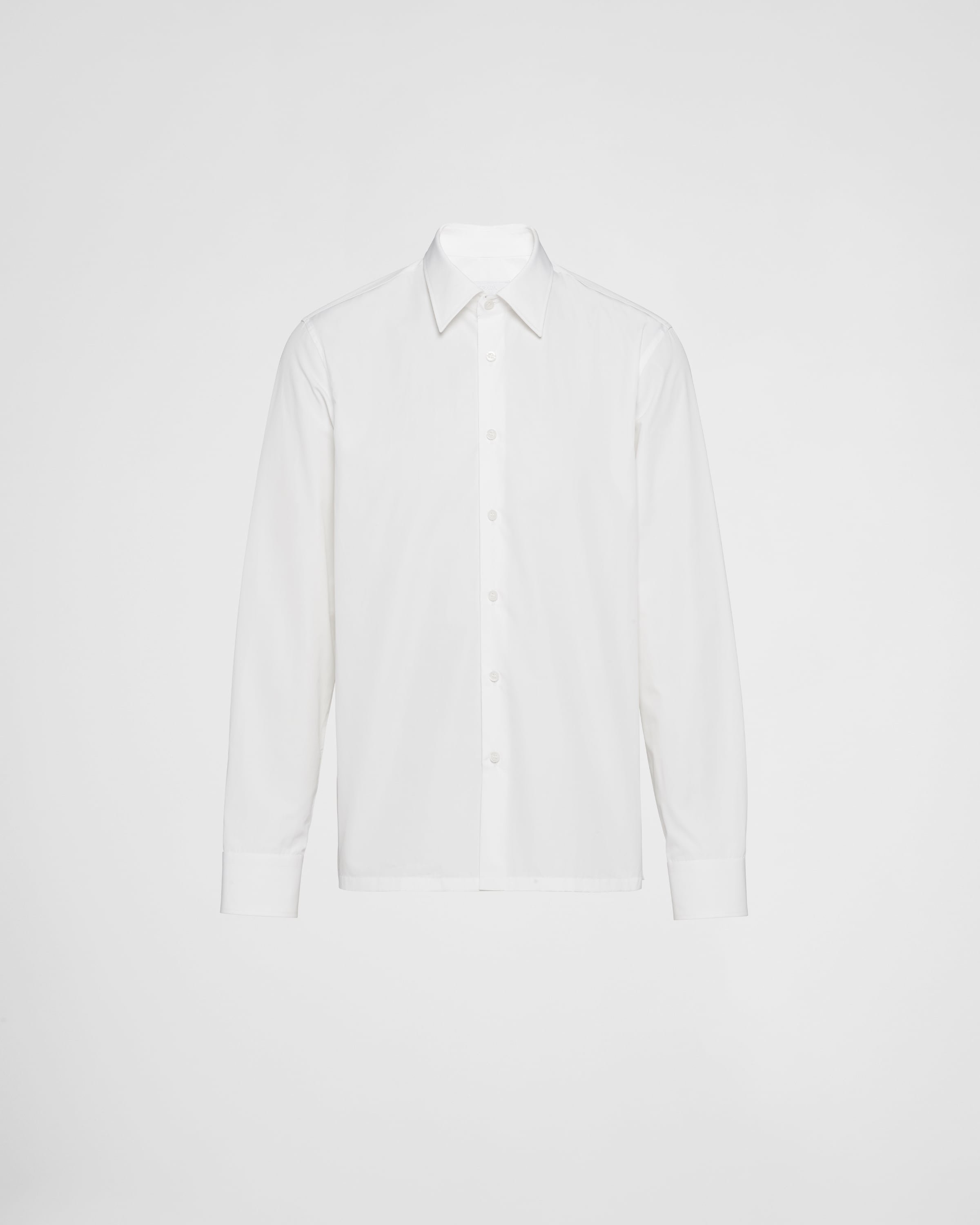 This straight-cut cotton shirt offers timeless allure. Classic collar and opening with covered buttons. The fabric triangle logo patch on the back adds an original touch. - Product code: UCN482_1XV2_F0009_S_231 - Straight cut - Classic collar - Straight hem - Classic cuffs - Opening with mother-of-pearl buttons - Fabric triangle logo on back - Contrasting stitching - Imported - The model is 189 cm tall and wears a size 48 Height: 72cm MATERIALS Main material: 100% cotton