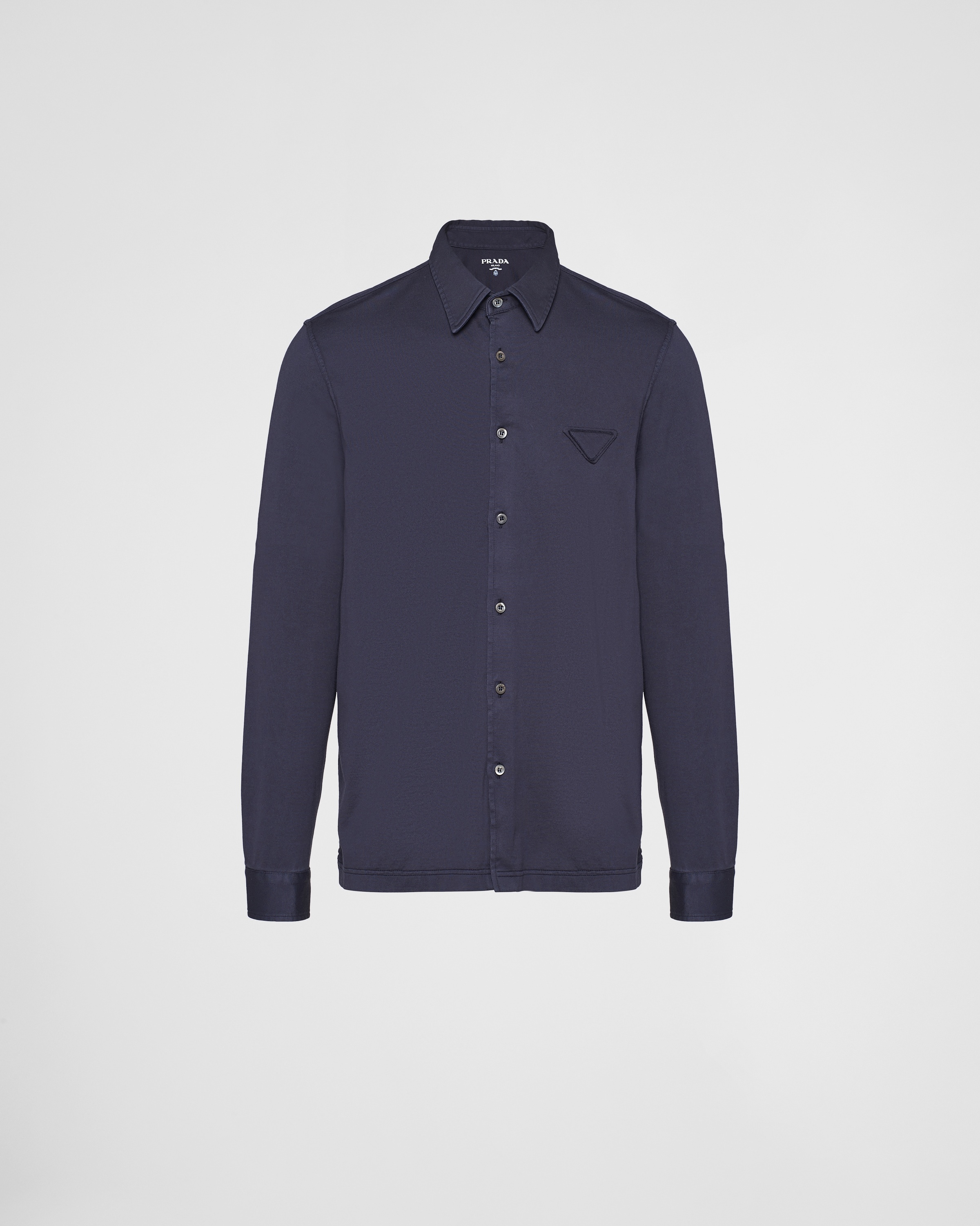 Relaxed allure distinguishes this cotton shirt with a boxy silhouette, an emblem of modern elegance. The simple but refined garment is completed by mother-of-pearl buttons and is decorated with the fabric triangle logo. - Product code: UJL92A_13CC_F0124_S_232 - Boxy fit - Long sleeves. - Straight hem - Mother-of-pearl buttons - Fabric triangle logo - Imported - The model is 189 cm tall and wears a size 38 Height: 72cm MATERIALS Main material: 100% cotton