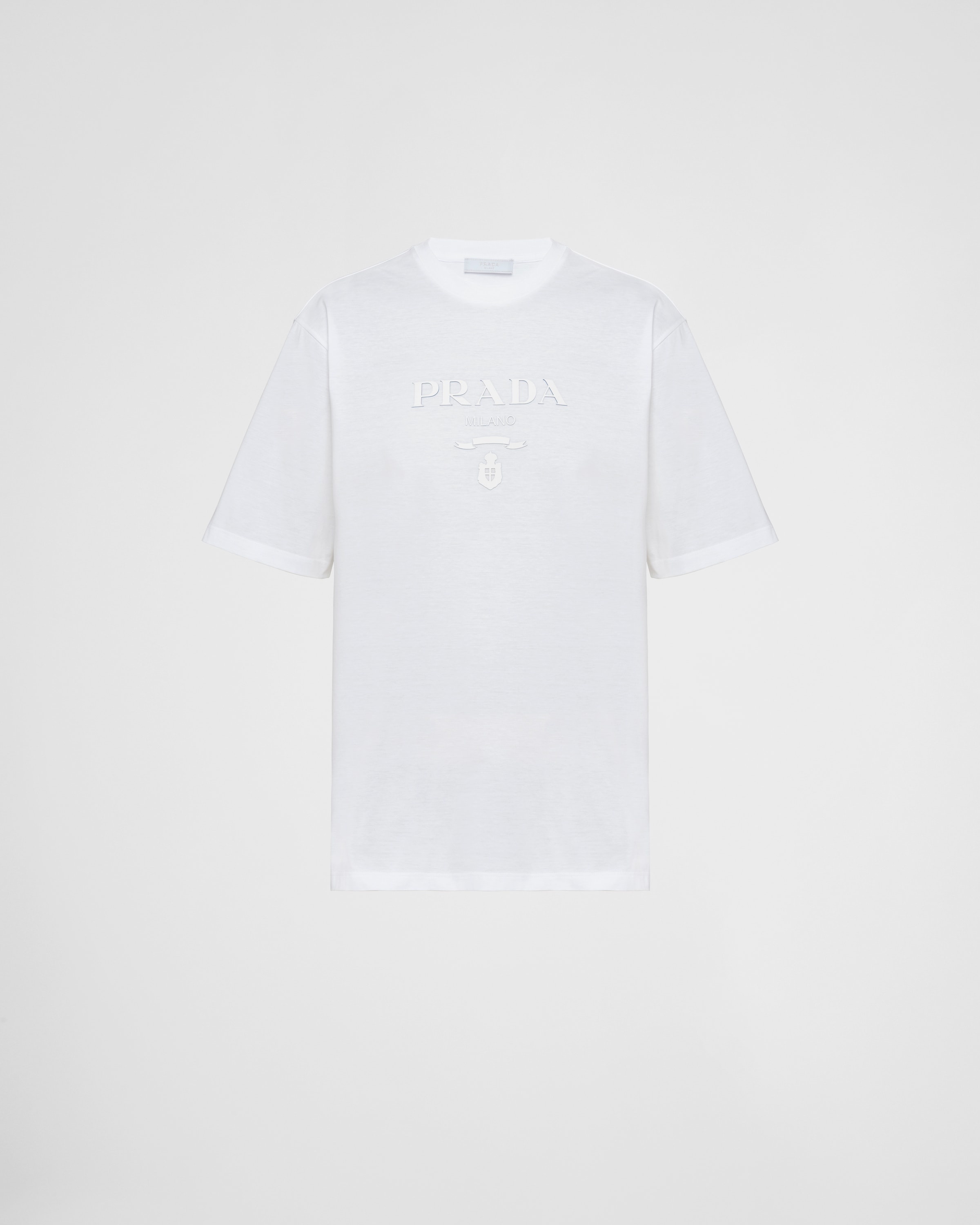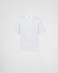 An essential item of the brand, the Prada jersey T-shirt embodies the luxury of simplicity that becomes an attitude and search to reinvent the bases and propose new meanings. The design is accented with the brand's emblematic lettering logo presented here in a silicone version. - Product code: UJN815_1052_F0009_S_221 - Boxy cut - Short sleeves - Ribbed knit crew neck - Straight hem - Length: 72 cm. Size: M - Embossed Prada silicone logo with contrasting border - Imported - The model is 187 cm tall and wears a size 48 Height: 72cm MATERIALS Main material: 100% cotton