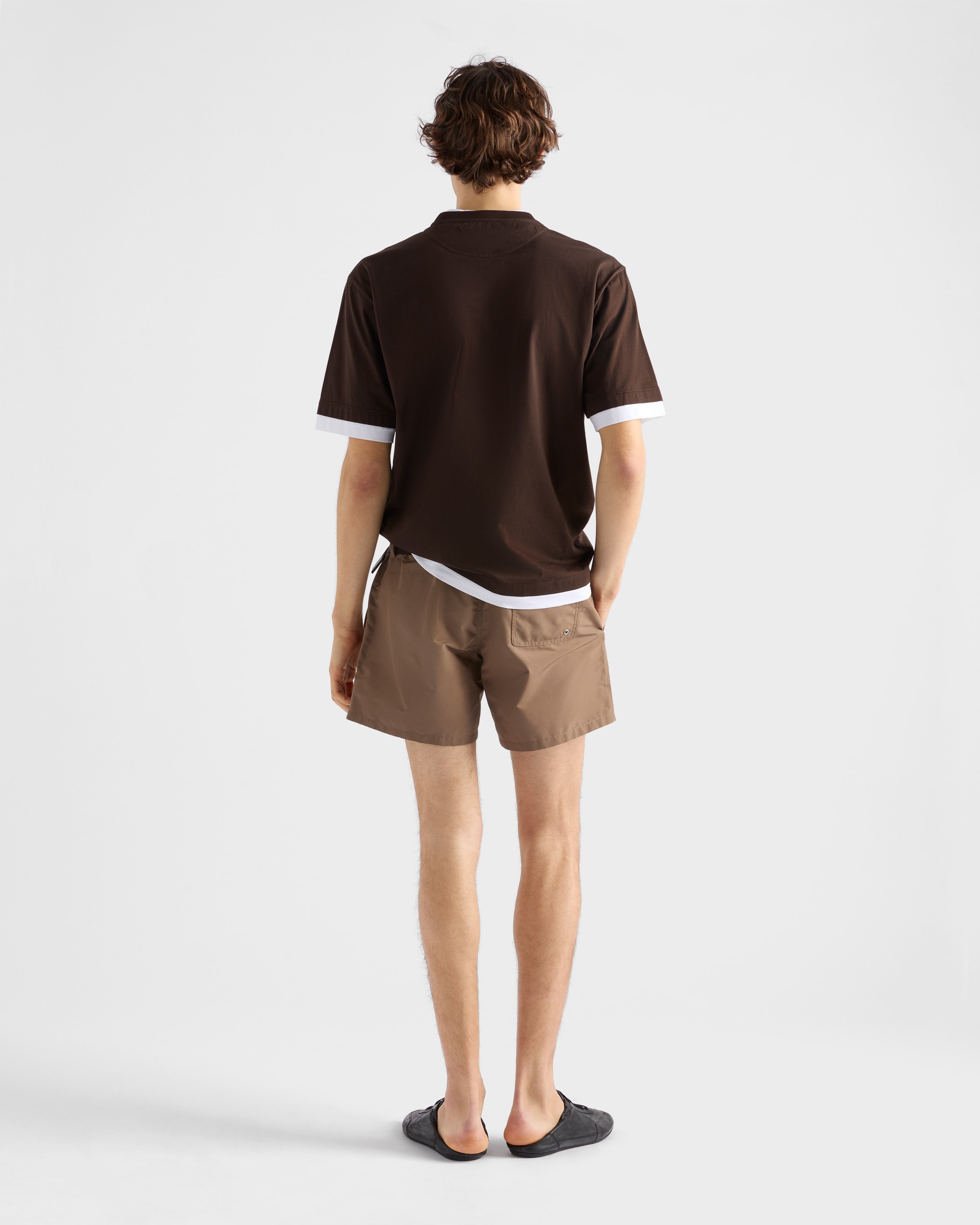 The classic cotton tee is reinterpreted with layering and contrasts that add a new touch to the sporty silhouette. The style defined by a relaxed fit is decorated with the emblematic fabric triangle logo. - Product code: UJN912_11CD_F0192_S_OOO - Boxy fit - Short sleeves - Straight hem - Conceptual triangle - Length 70 cm, Size M - Imported - The model is 187 cm tall and wears a size 48 Height: 70cm MATERIALS Main material: 100% cotton