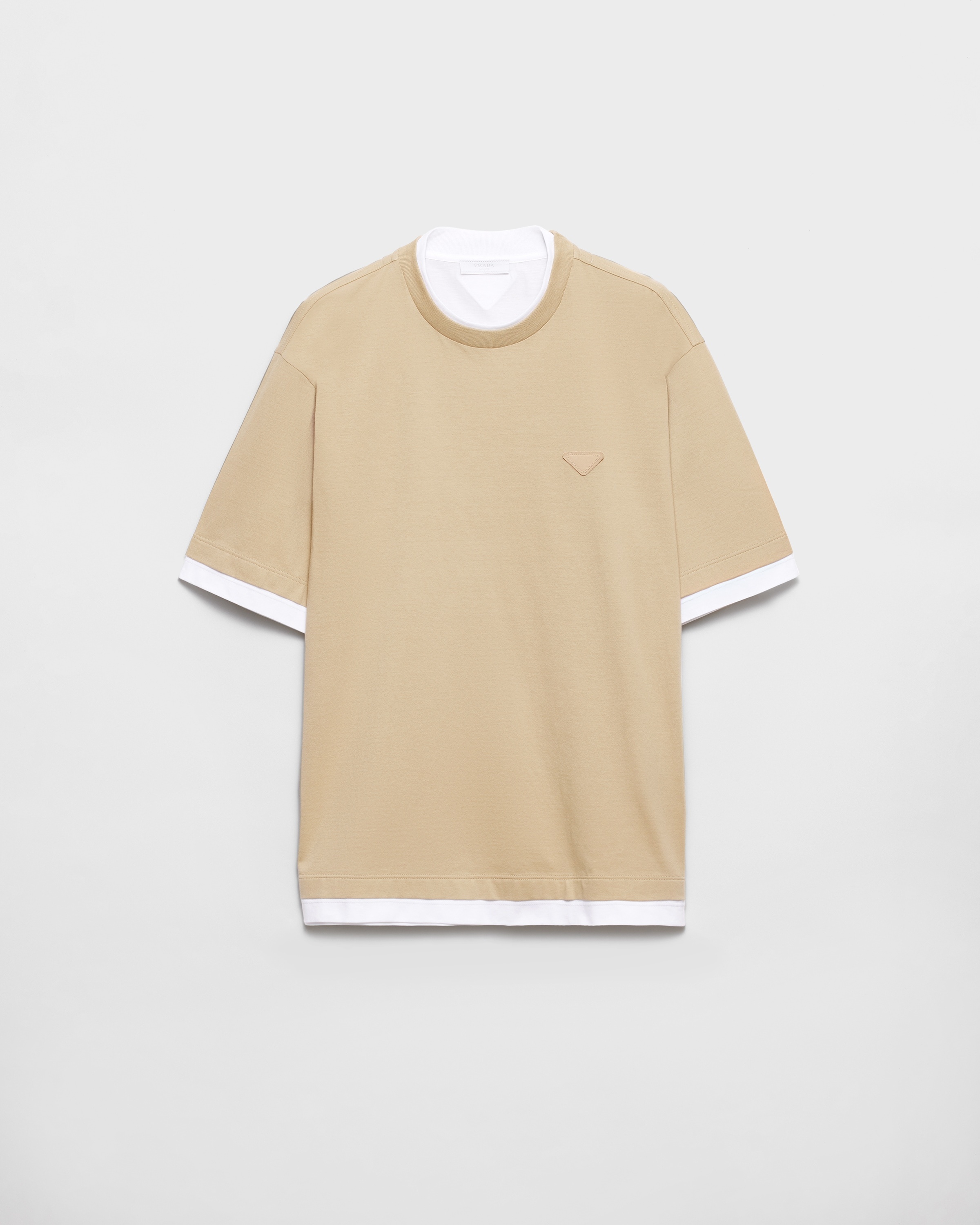 The classic cotton tee is reinterpreted with layering and contrasts that add a new touch to the sporty silhouette. The style defined by a relaxed fit is decorated with the emblematic fabric triangle logo. - Product code: UJN912_11CD_F0065_S_OOO - Boxy fit - Short sleeves - Straight hem - Conceptual triangle - Length 70 cm, Size M - Imported - The model is 189 cm tall and wears a size 48 Height: 70cm MATERIALS Main material: 100% cotton