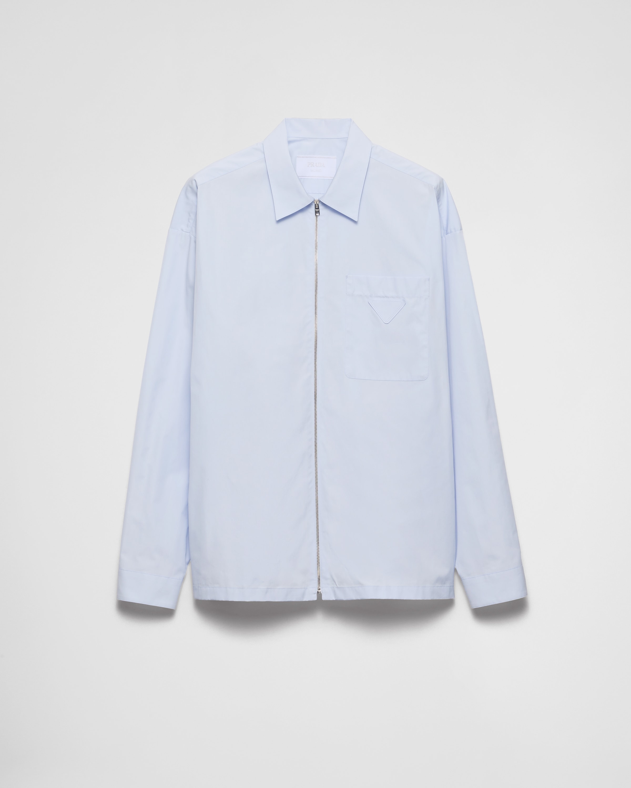 The duality that characterizes Prada collections is reflected in the creation of hybrid designs that blend different materials and styles to create something innovative. The shirt, a menswear wardrobe staple, with a classic collar and loose fit is reimagined with a zipper closure that gives it a contemporary touch. The iconic fabric triangle logo patch decorates the garment. - Product code: SC540_10IV_F0AHQ_S_211 - Loose fit - Classic collar - Classic breast pocket - Straight hem - Cuff with mother-of-pearl button - Zipper closure - Fabric triangle logo on the front - Imported - The model is 188 cm tall and wears a size 48 Height: 72cm MATERIALS Main material: 100% cotton