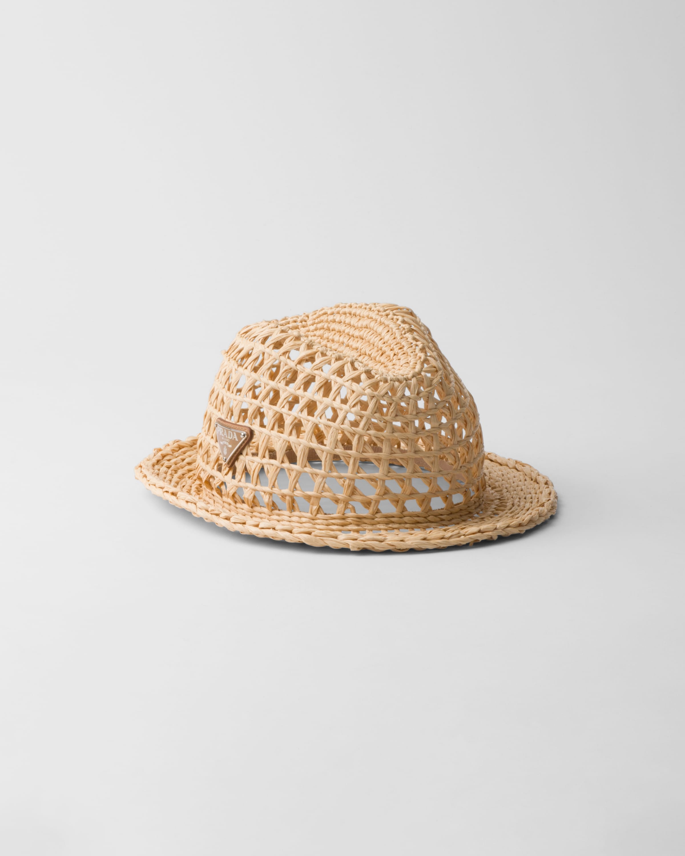 Inspired by the lightness of summer, this Fedora hat features an artisan-crafted crochet design. The accessory is embellished with the distinctive enameled metal triangle logo. - Product code: 2HC360_2M2S_F0018 - Enameled metal triangle logo - Imported MATERIALS Main material: Viscose