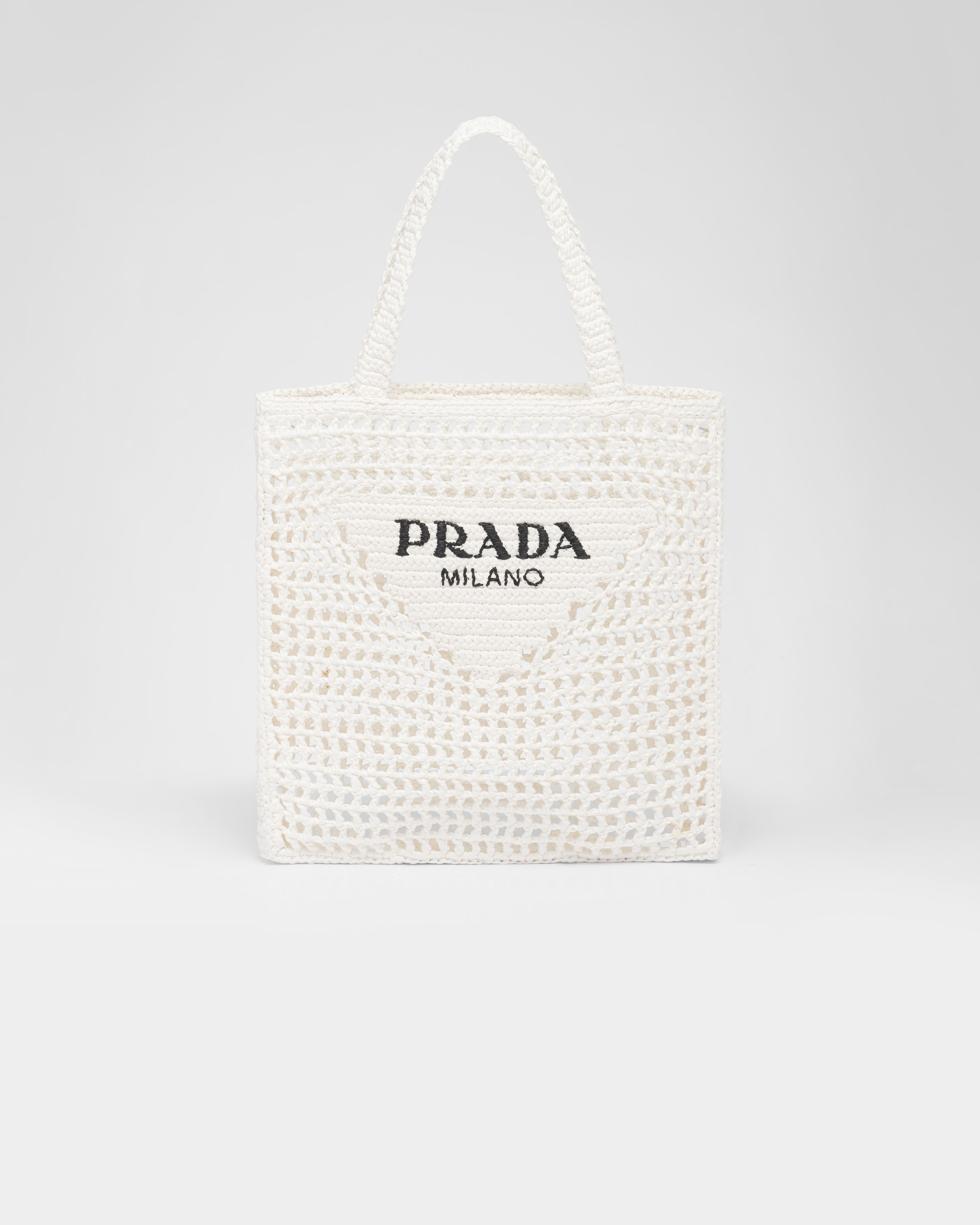 This crochet tote bag with a soft, deconstructed design boasts a light and summery mood. A new interpretation of Prada's emblematic triangle decorates the front and is embellished at its center with the embroidered lettering logo. - Product code: 1BG393_2A2T_F0009_V_OOO - Raffia-effect yarn - Crochet workmanship - Embroidered lettering logo on the front - Unlined - Imported Height: 38cm Width: 36cm Length: 3cm MATERIALS Main material: Viscose