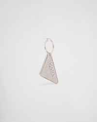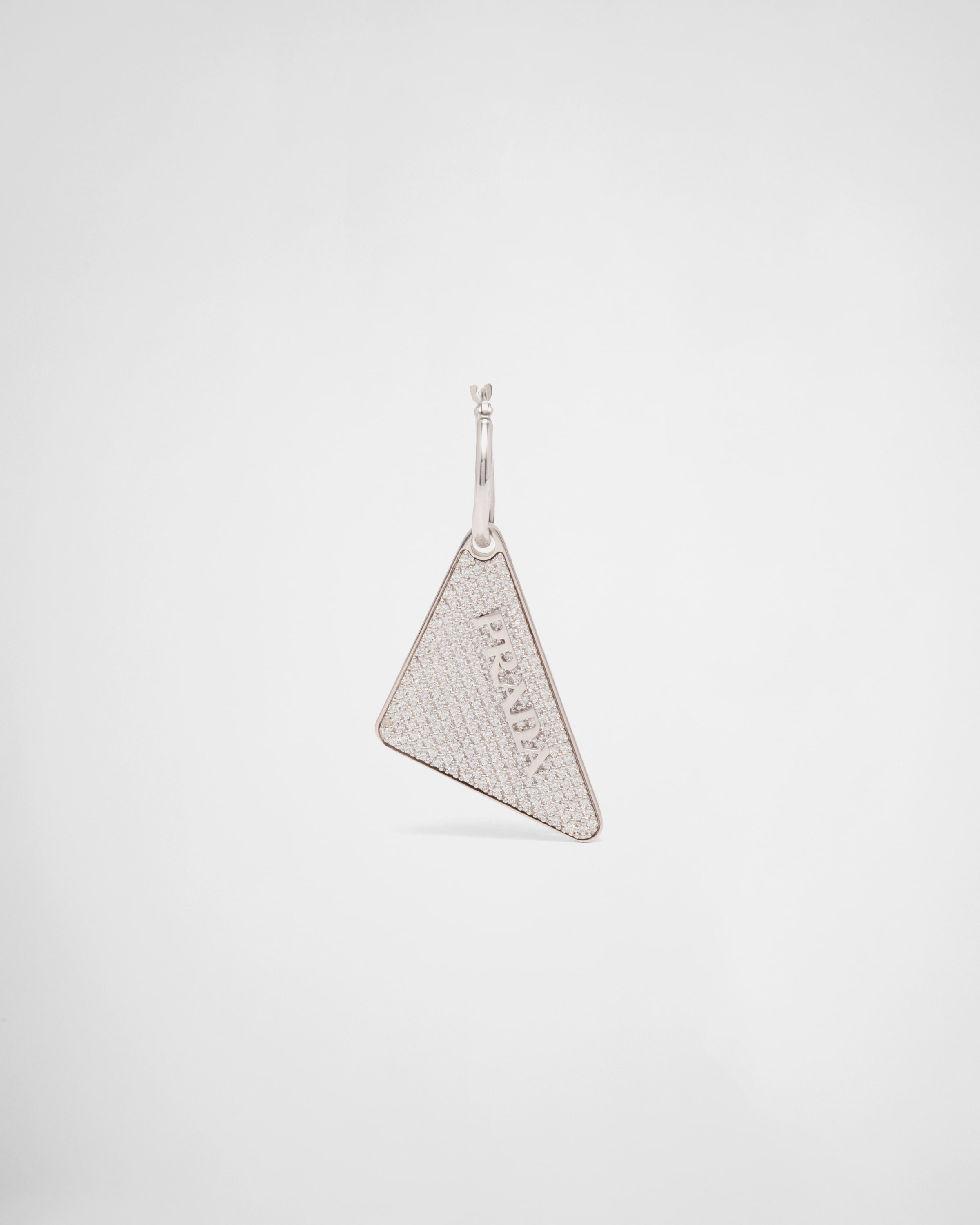 Prada plays with its most iconic shape, the triangle, which results in precious new details. The geometric logo illuminated with zircons defines the pendant of this single earring made of 925 sterling silver with a palladium finish. - Product code: 1JO767_2DZ5_F0T7O - 925 sterling silver with zircons - Palladium finish - Visible triangle logo - Clip earring - Right ear - Imported Width: 4.23cm MATERIALS Main material: 925 silver