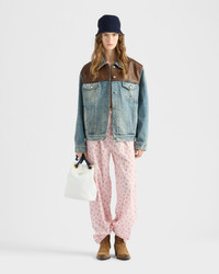 New proportions and details with vintage allure define this bleached denim blouson jacket. The design is enriched with a leather insert with distressed finish that emphasizes the strong, oversized lines of the silhouette. - Product code: GFB322_1703_F0008_S_OOO - Bleached treatment - Unlined garment - Oversized fit - Shirt-style collar - Long sleeves - Front button closure - Contrasting top-stitching - Flap pockets with button - Low vertical welt pockets - Center-back length: 62 cm, Size: XS - Straight hem with side buttons for double adjustable - Leather inserts - Pressed garment - Prada Milano logo label on the back - Imported - The model is 178 cm tall and wears a size 38 Height: 64cm MATERIALS Main material: 100% cotton