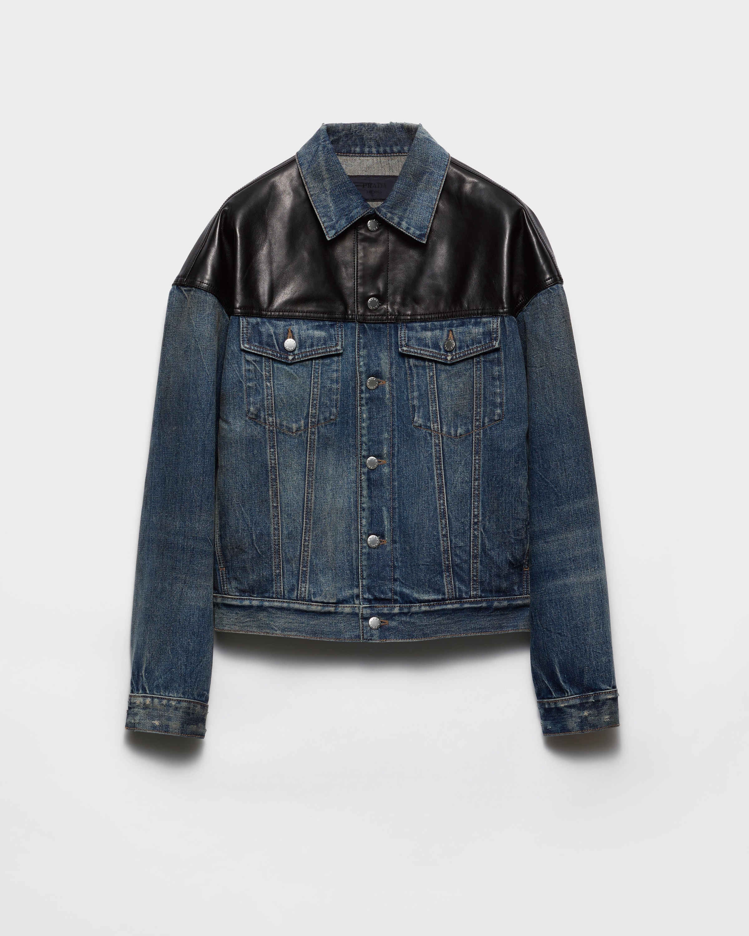 The timeless denim jacket is reinterpreted with new proportions and bold touches. The leather insert emphasizes the strong lines of the shoulders and adds a sophisticated note to the design, completed with distressed details with vintage allure. - Product code: GEB257_1638_F0008_S_AA1 - Washed treatment - Unlined - Classic fit - Shirt-style collar - Long sleeves, cuffs with button - Front button closure - Contrasting stitching - Flapped patch pockets with button on the chest - Center-back length: 64 cm. Size: M - Adjustable hem with buttons - Triangle logo - Leather insert - Garment with pressed sleeves - Prada Milano logo label on the back - Imported - The model is 187 cm tall and wears a size 48 Height: 64cm MATERIALS Main material: 100% cotton