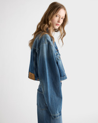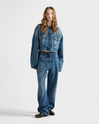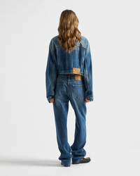 A boxy cut and rounded sleeves characterize this denim blouson jacket with a vintage finish. The contemporary lines of the silhouette are combined with details with vintage charm. - Product code: GFB318_16PK_F0V3N_S_OOO - Washed denim treatment - Unlined garment - Loose fit - Shirt-style collar - Long sleeves, cuffs with one button - Front button closure - Contrasting stitching - Flapped patch pockets with button on the front - Center-back length: 45 cm, Size: XS - Straight hem with buttons for double adjustment on the back - Prada Milano logo label on the back - Imported - The model is 176 cm tall and wears a size 38 Height: 45cm MATERIALS Main material: 100% cotton