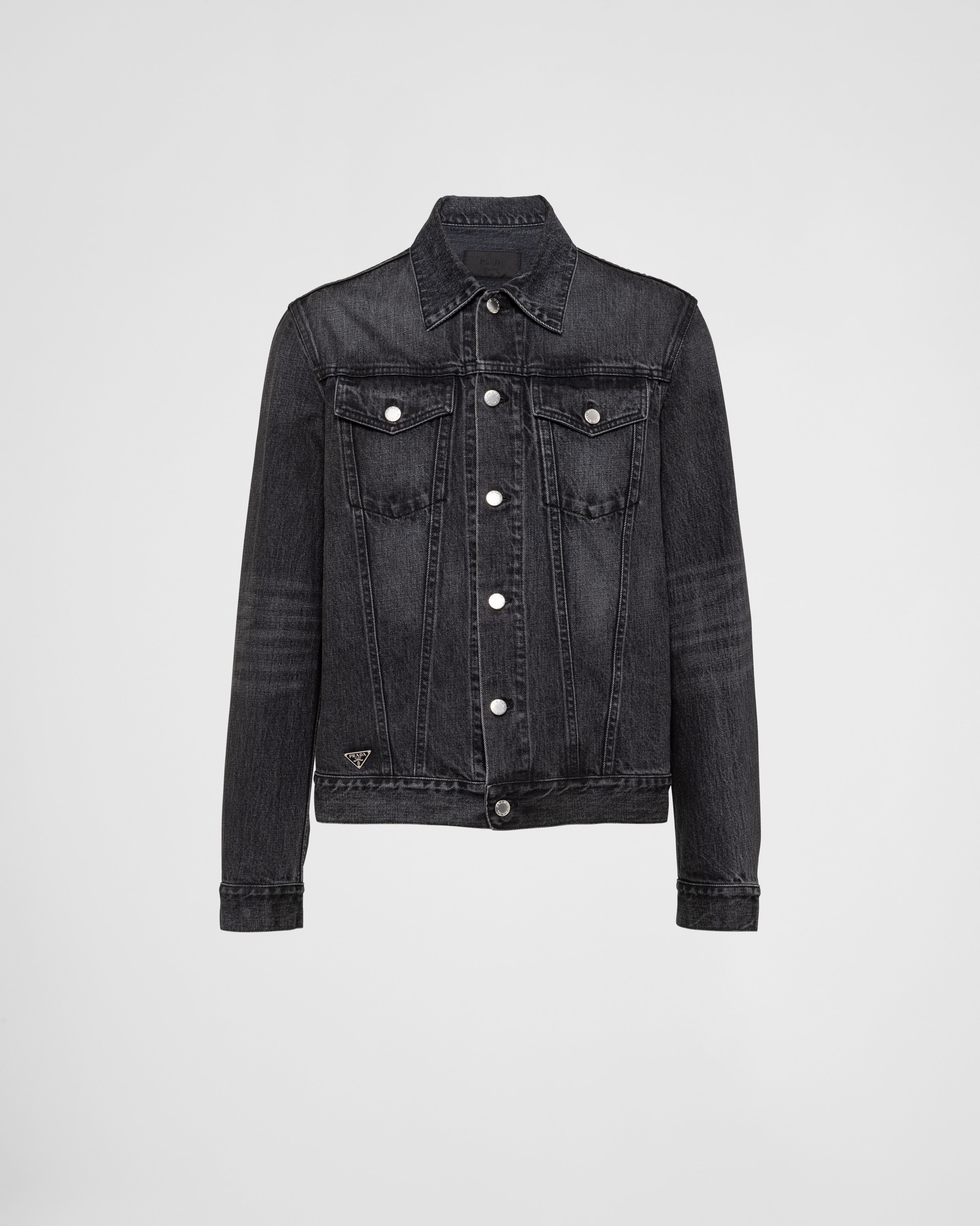 This denim blouson jacket with vintage allure recalls classic garments from the 1950s. This garment, part of the Spring Summer 2023 collection, has a used effect and is accented with a special label with red print on the back that recalls a logo from the archive. - Product code: GEB227_12K8_F0557_S_231 - Washed denim - Unlined garment - Classic fit - Shirt collar - Long sleeves - Cuffs with button - Front button closure - Tonal top-stitching - Buttoned flap patch pockets on the top - Length from center back: 64 cm, Size: M - Adjustable hem with buttons - Triangle logo - Prada Milano logo label on the back - Imported - The model is 188 cm tall and wears a size 48 Height: 64cm MATERIALS Main material: 100% cotton