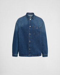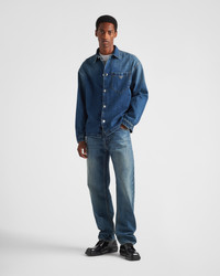 This denim shirt, an essential wardrobe item, has a contemporary silhouette that is both simple and refined. The style with boxy lines delineated with contrasting top-stitching is enhanced by the used denim treatment that gives the garment a vintage effect. The enameled metal triangle logo on the breast pocket adds an iconic touch. - Product code: GEC066_14EF_F0008_S_212 - Used denim treatment - Boxy fit - Shirt collar - Long sleeves, buttoned cuff - Front button closure - Contrasting top-stitching - Patch pocket on the chest - Straight hem - Length from center back: 72 cm, Size: M - Triangle logo - Imported - The model is 189 cm tall and wears a size 48 Height: 72cm MATERIALS Main material: 100% cotton