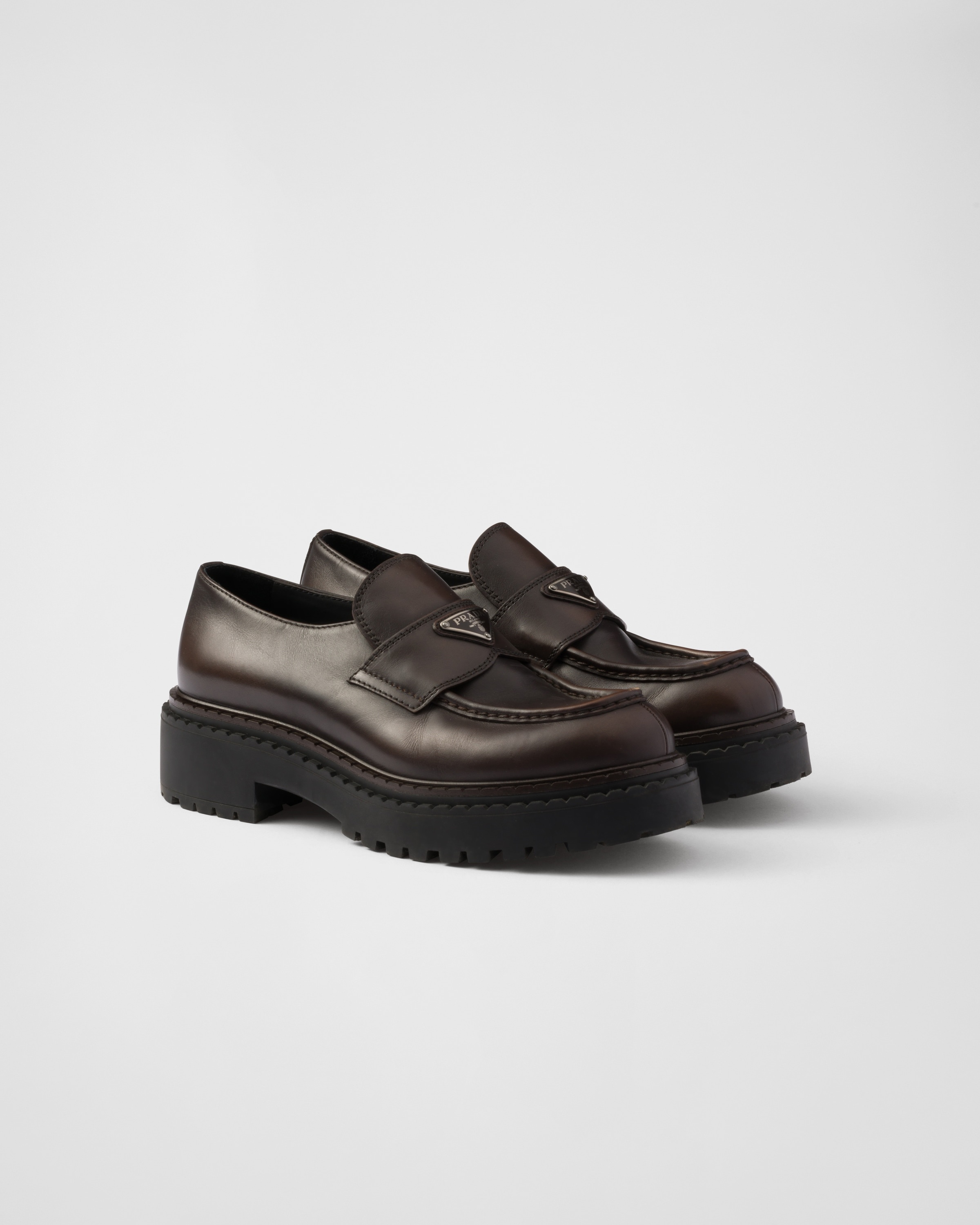 Artisanal details and contemporary elements animate the design of these leather loafers with chunky rubber soles in a new interpretation of a timeless style. - Product code: 2DE148_3KY8_F0003_F_G001 - Band with enameled metal triangle logo - Apron with stitched raised edge - Chunky rubber sole with double welt - Heel height: 60 mm - Leather insole - Imported MATERIALS Main material: Calfskin