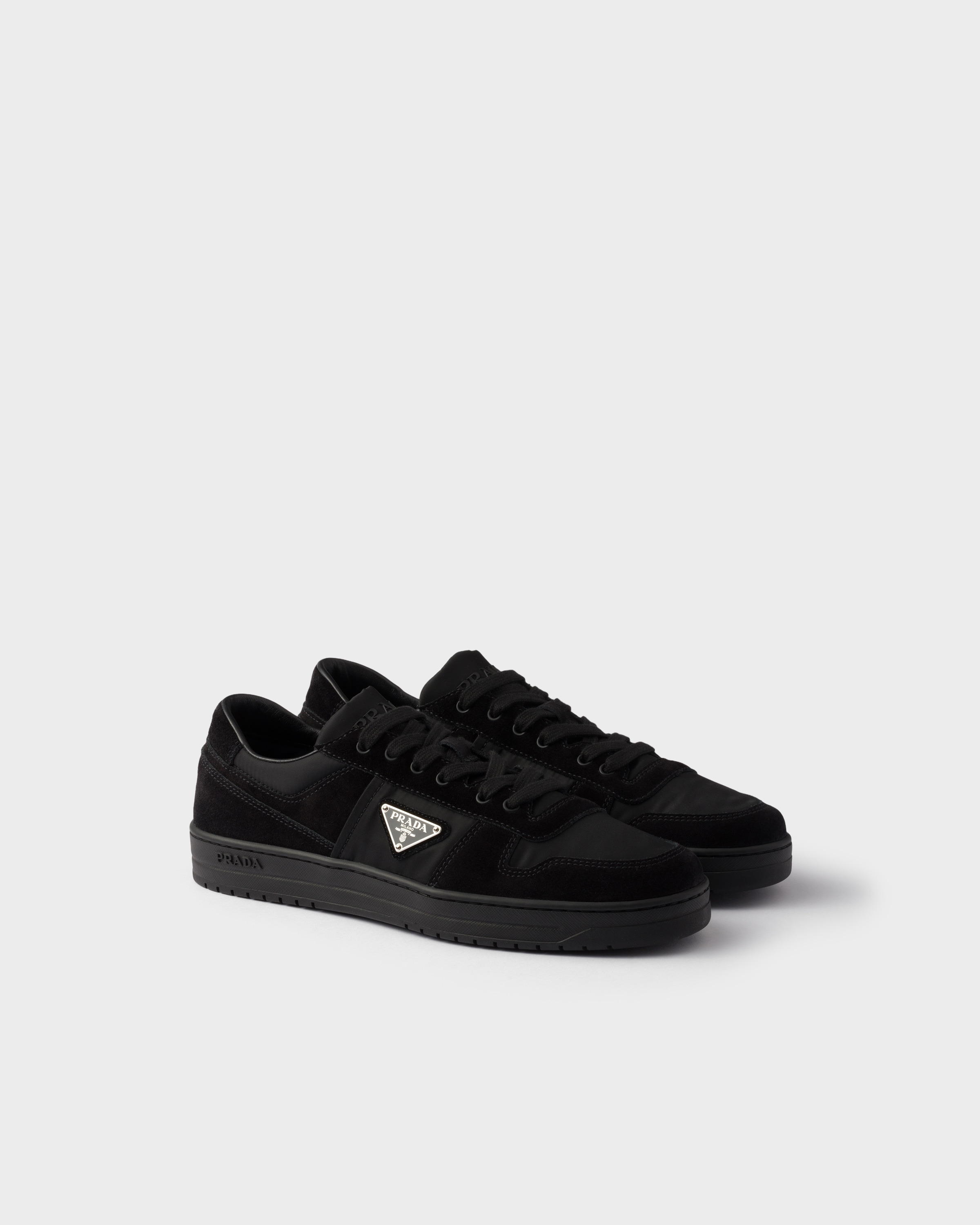 Downtown sneakers, inspired by basketball shoes, stand out for their sporty design with distinctive, refined details. The iconic style, embellished with different interpretations of the Prada logo, comes in suede with Re-Nylon details. - Product code: 2EE364_LOW_F0002_F_D002 - With metal eyelets and cotton laces - Upper with enameled metal triangle logo - Prada Milano logo embossed on the tongue - Lightweight box sole with embossed logo on the side - Sole height: 35 mm - Removable leather-covered insole - Imported MATERIALS Main material: Calfskin