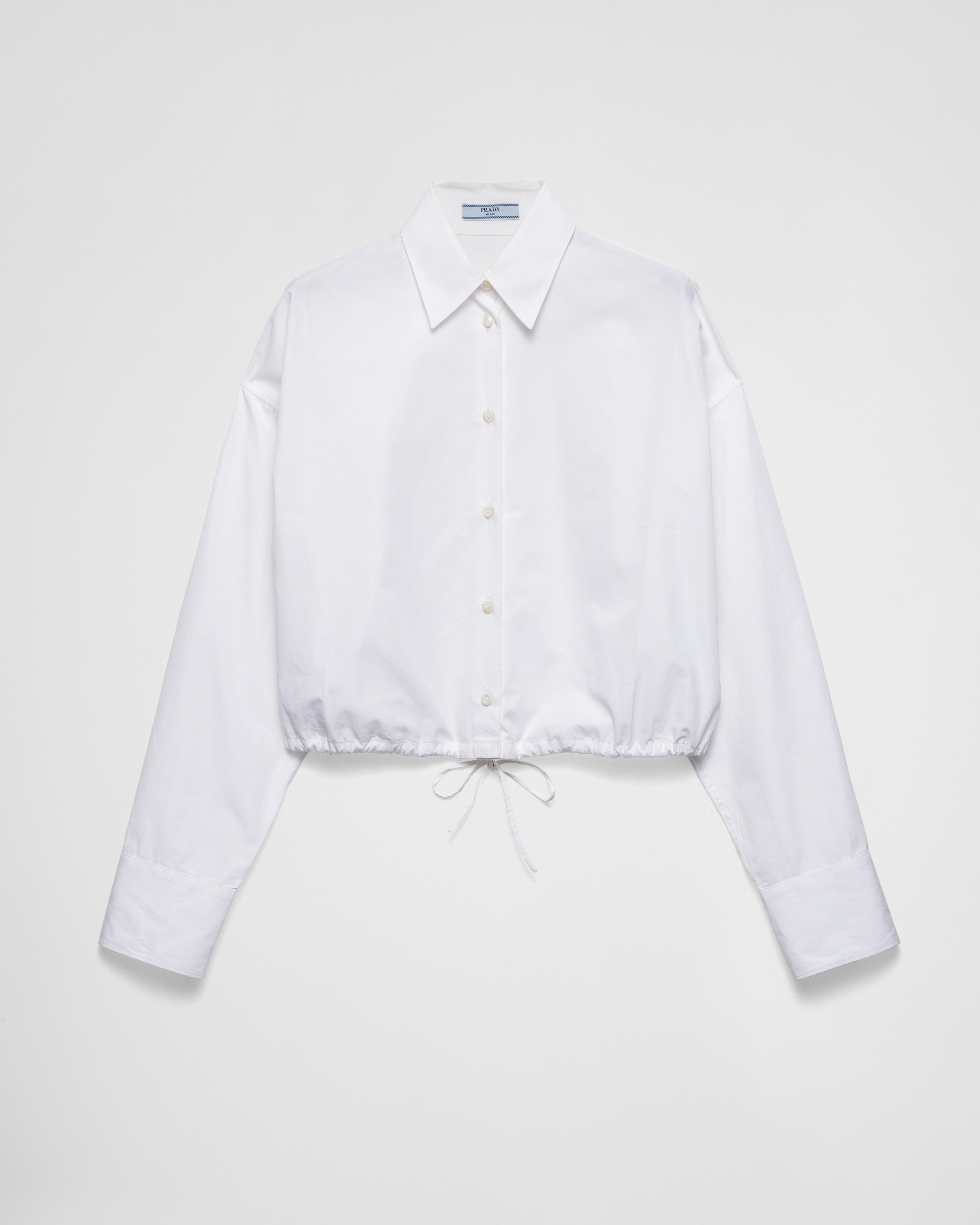 Wardrobe staples are reinterpreted with new lines and unexpected details. This poplin shirt is characterized by its soft, round volume created by the drawstring hem that gives the menswear-inspired style a casual and contemporary touch. - Product code: P400I_1XV2_F0009_S_OOO - Menswear fit - Unlined - Classic collar - Front button closure - Sleeves with classic cuffs - Fabric triangle logo - Straight hem - Drawstring detail on the hem - Imported - The model is 178 cm tall and wears a size 38 Height: 45cm MATERIALS Main material: 100% cotton