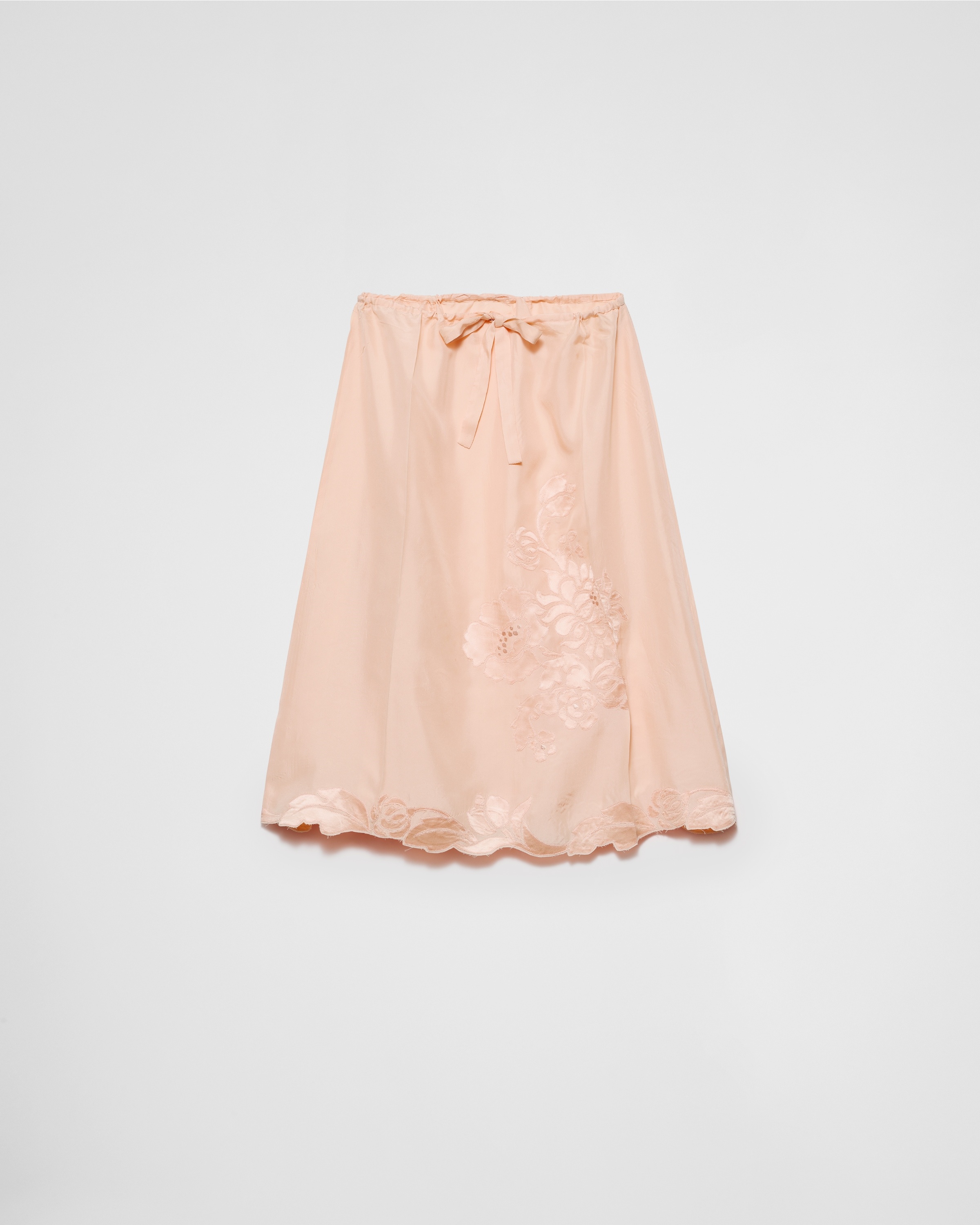 Refined details with vintage allure embellish this silk habutai skirt with soft lines, a sophisticated design that looks to the elegance of the past to redefine contemporary codes. - Product code: P128YR_15YI_F0075_S_OOO - Flared fit - Unlined - Front drawstring closure - Embroidered logo - Tonal satin embroidery - Imported - The model is 178 cm tall and wears a size 38 Height: 67cm MATERIALS Main material: 100% silk