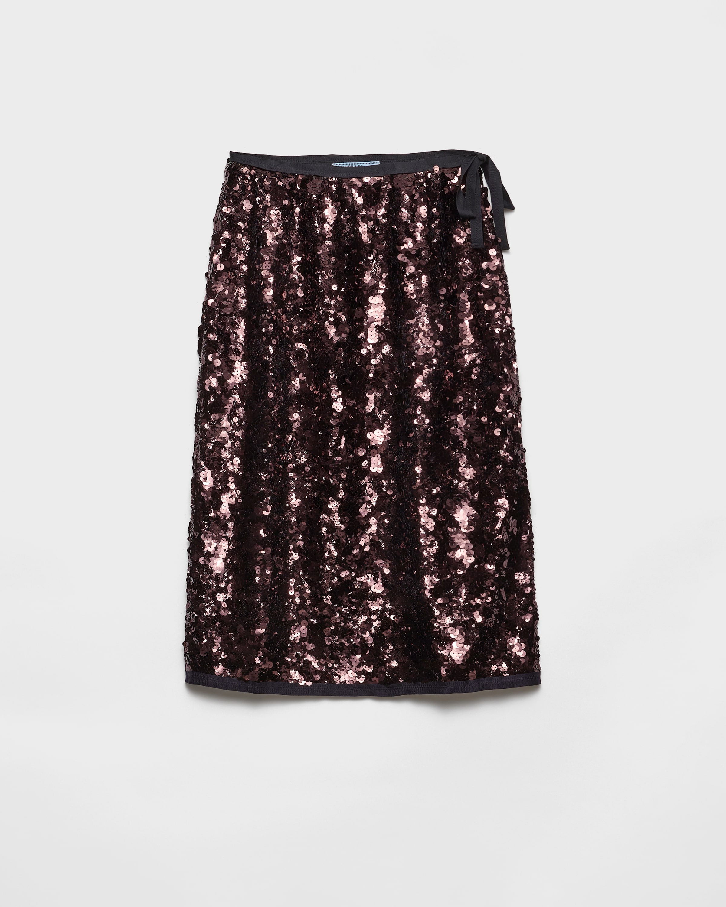 Delicately embroidered with all-over sequins, this skirt captures Prada’s sophisticated spirit, blending radiant design with exquisite artisanal craftsmanship. - Product code: P120ZR_176A_F0051_S_OOO - Sheath fit - Lined garment - Side closure with snap buttons and ribbon - Imported - The model is 180 cm tall and wears a size 38 Height: 65cm MATERIALS Main material: 100% polyamide - 100% polyester