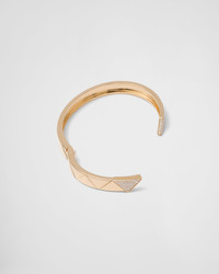 A pave of diamonds embellishes and illuminates the surface of the iconic triangle, first introduced in 1913 as a hallmark on Mario Prada's steamer trunks and now the protagonist of this fine jewelry collection. The juxtaposed diamonds create an original play of light on this bangle bracelet made of recycled yellow gold, accentuating the elegance of the line and the artisan know-how used to produce unique designs. This bracelet with a modernist design has a hidden hinge clasp for a functional yet sophisticated fit. - Product code: 1JB455_2FOW_F00Y4 - 750 Yellow Gold (18 kt) with diamonds - Diamonds: 51 diamonds - Total carats: 0.344 ct - Cut: brilliant - Color: G+ - Clarity: VS+ - Laser-cut logo on the side - Hinged clasp - Consult the Size Guide to find your size - Made in Italy - Each step of Prada's responsible gold and diamond production chain is verified and traceable thanks to Aura Blockchain technology. - Imported MATERIALS Gold 750