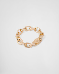 Coming from the Prada archives, the image of the chain takes on new forms and new meanings. For the fine jewelry collection, the chain is given a bold, sophisticated design embodying strength and elegance. Each link of this bracelet in recycled yellow gold is beveled on both sides to create an elegant curved line inspired by the bottom of the iconic Prada Cleo bag. The emblematic triangle, first introduced in 1913 as a hallmark on Mario Prada's steamer trunks, is reimagined as a charm on this bracelet with push-button box clasp. - Product code: 1JB405_2FKN_F0056 - 750 Yellow Gold (18 kt) - Triangle logo - Push-button box clasp - Consult the Size Guide to find your size - Made in Italy - Each step of Prada's responsible gold and diamond production chain is verified and traceable thanks to Aura Blockchain technology. - Imported MATERIALS Gold 750