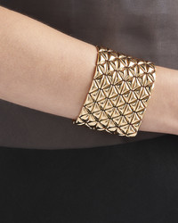 A continuously evolving symbol, the triangle embodies Prada's dualistic and unconventional soul, lending itself to always new and surprising interpretations. Introduced in 1913 by Mario Prada, the iconic geometric shape becomes a structural element of this bracelet made of recycled yellow gold with an original cut. The jewel reinterprets the classic cuff bracelet with refined, contemporary lines, transforming it into a sculpture design. The unique, precious object is an expression of a fine jewelry collection that blends creativity, innovation and masterful artisan know-how. - Product code: 1JB474_2CID_F0056 - 750 Yellow Gold (18 kt) - Laser-cut logo on the inside - Double push-button clasp - Consult the Size Guide to find your size - Made in Italy - Each step of Prada's responsible gold and diamond production chain is verified and traceable thanks to Aura Blockchain technology. - Imported MATERIALS Gold 750