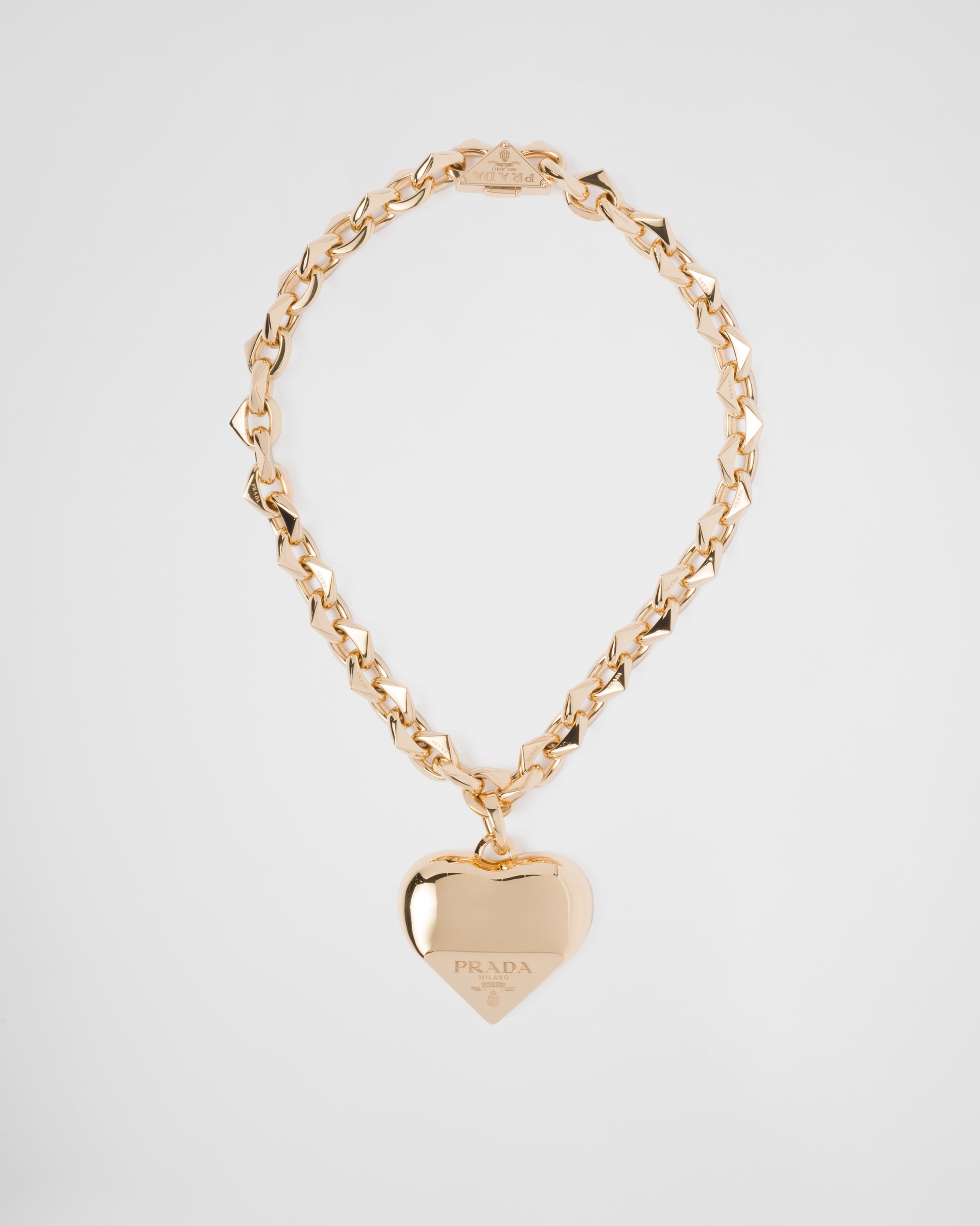 The heart, one of the universal symbols of love, becomes the protagonist of Prada's fine jewelry collection. The top of the pendant with bold pop-inspired lines elegantly contrasts with the clean, geometric elements of the logo on the bottom. Each link in the chain is inspired by the emblematic triangle, creating a refined, iconic silhouette. The piece in recycled yellow gold embodies the brand's timeless tradition and ability to combine different concepts in a continuous dialogue aimed at affirming uniqueness and artisan know-how. - Product code: 1JCA30_2DA5_F0056 - 750 Yellow Gold (18 kt) - Visible logo - Push-button box clasp - Length: 45 cm (17.71 inches) - Made in Italy - Each step of Prada's responsible gold and diamond production chain is verified and traceable thanks to Aura Blockchain technology. - Imported MATERIALS Gold 750