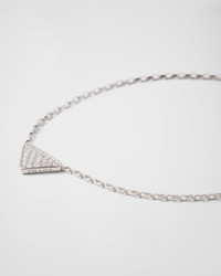 The triangle, Prada's identifying element, becomes the protagonist of this fine jewelry collection. Created as Mario Prada's logo for his travel trunks in 1913, it has been reinvented in a micro size on this pendant with a simple geometric shape embellished with pave diamonds. The sophisticated necklace made of recycled white gold embodies the brand's timeless tradition and its ability to combine different concepts in a continuous dialog affirming its uniqueness and masterful artisan know-how. - Product code: 1JCA38_2FPF_F020I - 750 White Gold (18 kt) with diamonds - Diamonds: 21 diamonds – Total carats: 0.30 ct - Cut: Round – Color: G - Clarity: VS+ - Logo on medallion - Triangle pendant: 1.3 cm (0.51 inches) - Lobster claw clasp - Adjustable size - Length 45 cm (17.71 inches) adjustable to 43 cm (16.92 inches) and 41 cm (16.14 inches) - Made in Italy - Each step of Prada's responsible gold and diamond production chain is verified and traceable thanks to Aura Blockchain technology. - Imported MATERIALS Gold 750