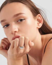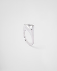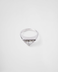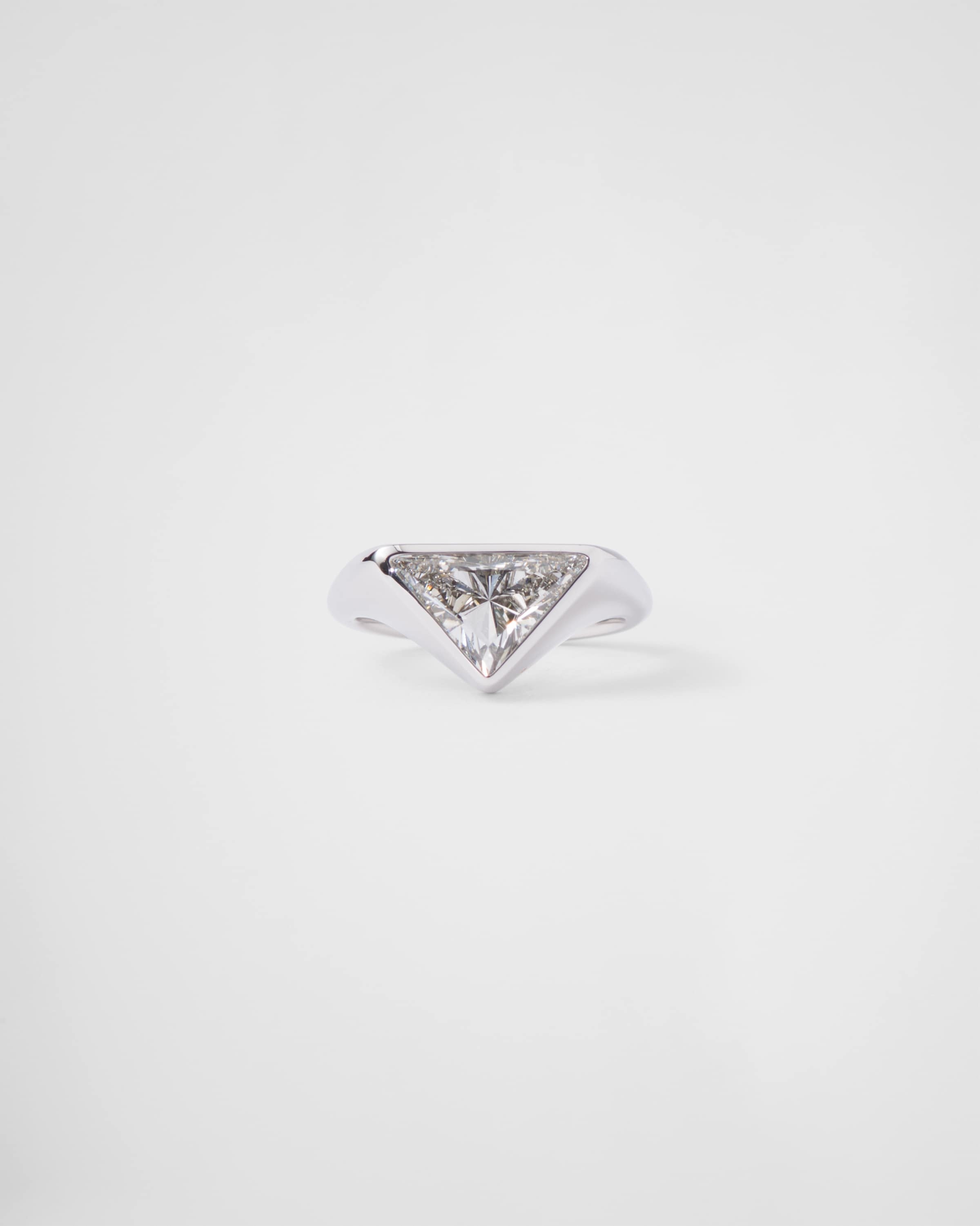Artisan tradition and technological innovation meet to create unique pieces that redefine the classic codes of jewelry. Symbols of excellence and progress, the new Prada Cut diamonds produced in the laboratory have an original cut inspired by the iconic triangle. First introduced by Mario Prada in 1913, the geometric shape is also recalled in the design of this ring made of recycled white gold, featuring a sparkling diamond that enhances the design with contemporary lines. - Product code: 1JA154_2FAT_F020I - 750 White Gold (18 kt) with Prada Cut Laboratory Grown Diamond - Total carats: circa 3.28 ct - Laser-cut logo on the back - Consult the Size Guide to find your size - Made in Italy - Each step of Prada's responsible gold and diamond production chain is verified and traceable thanks to Aura Blockchain technology. - Imported MATERIALS Gold 750