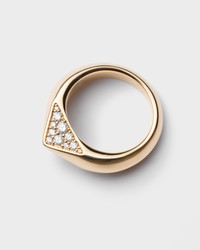 The Eternal Gold collection establishes a dialogue between archetypal forms and eternal symbols. The iconic geometric shape of the Prada triangle becomes the focal element of this ring made of recycled yellow gold illuminated with diamond pave. Bold, three-dimensional lines create a contemporary and distinctive jewel. - Product code: 1JA176_2FA1_F00Y4 - 750 Yellow Gold (18kt) with diamonds - Laser-cut logo on the inside - See the Size Guide to find your size - Made in Italy - Each step of Prada's responsible gold and diamond production is verified and traceable thanks to Aura Blockchain technology. - Imported MATERIALS Gold 750