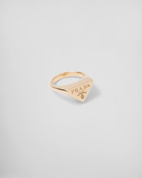 This signet ring made of recycled yellow gold reinterprets the shape of Prada's iconic triangle, an expression of elegance, modernity, innovation, and attention to artisan know-how. Prada's fine jewelry collection features the logo that has existed since the brand was born, proposing it again in this style with a sleek line and sophisticated character. - Product code: 1JA113_2CID_F0056 - 750 Yellow Gold (18 kt) - Triangle logo - Consult the Size Guide to find your size materials - Made in Italy - Each step of Prada's responsible gold and diamond production chain is verified and traceable thanks to Aura Blockchain technology. - Imported MATERIALS Gold 750