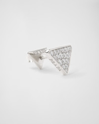 A continuously evolving symbol, the triangle embodies Prada's dualistic and unconventional soul, lending itself to always new and surprising interpretations. The iconic triangle first introduced by Mario Prada in 1913 is recalled in the silhouette of this single earring made of recycled white gold. The jewel with contemporary lines is embellished with pave diamonds, made with an innovative technique that combines stones of different sizes in a new pattern for a unique effect of shimmering light. - Product code: 1JO970_2FPF_F020I_V_OOS - 750 White Gold (18 kt) with diamonds - Diamonds: 21 diamonds – Total carats: 0.30 ct - Cut: Round – Color: G - Clarity: VS+ - Laser-cut logo on the side - For pierced ears - Made in Italy - Length: 1.35 cm (0.53 inches) - Each step of Prada's responsible gold and diamond production chain is verified and traceable thanks to Aura Blockchain technology. - Imported MATERIALS Gold 750