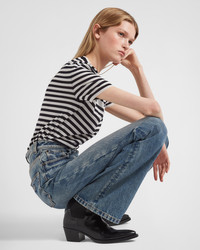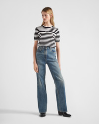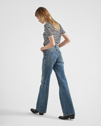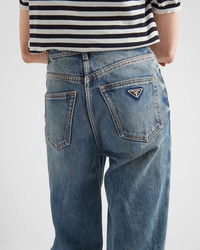 These sleek, modern high-rise denim jeans are characterized by the contrasting top-stitching and the bleached denim that gives the garment a vintage look. The enameled metal triangle logo stands out on the back. - Product code: GFP492_12O0_F0BAU_S_231 - Bleached denim - Menswear fit - High-rise waist - Hem width: 26 cm, Size: 25 - Zipper fly with button - Contrasting top-stitching - Curved front pockets with coin pocket - Back patch pockets - Total length 118cm, Size 25 - Triangle logo - Imported - The model is 178 cm tall and wears a size 38 Height: 118cm MATERIALS Main material: 100% cotton