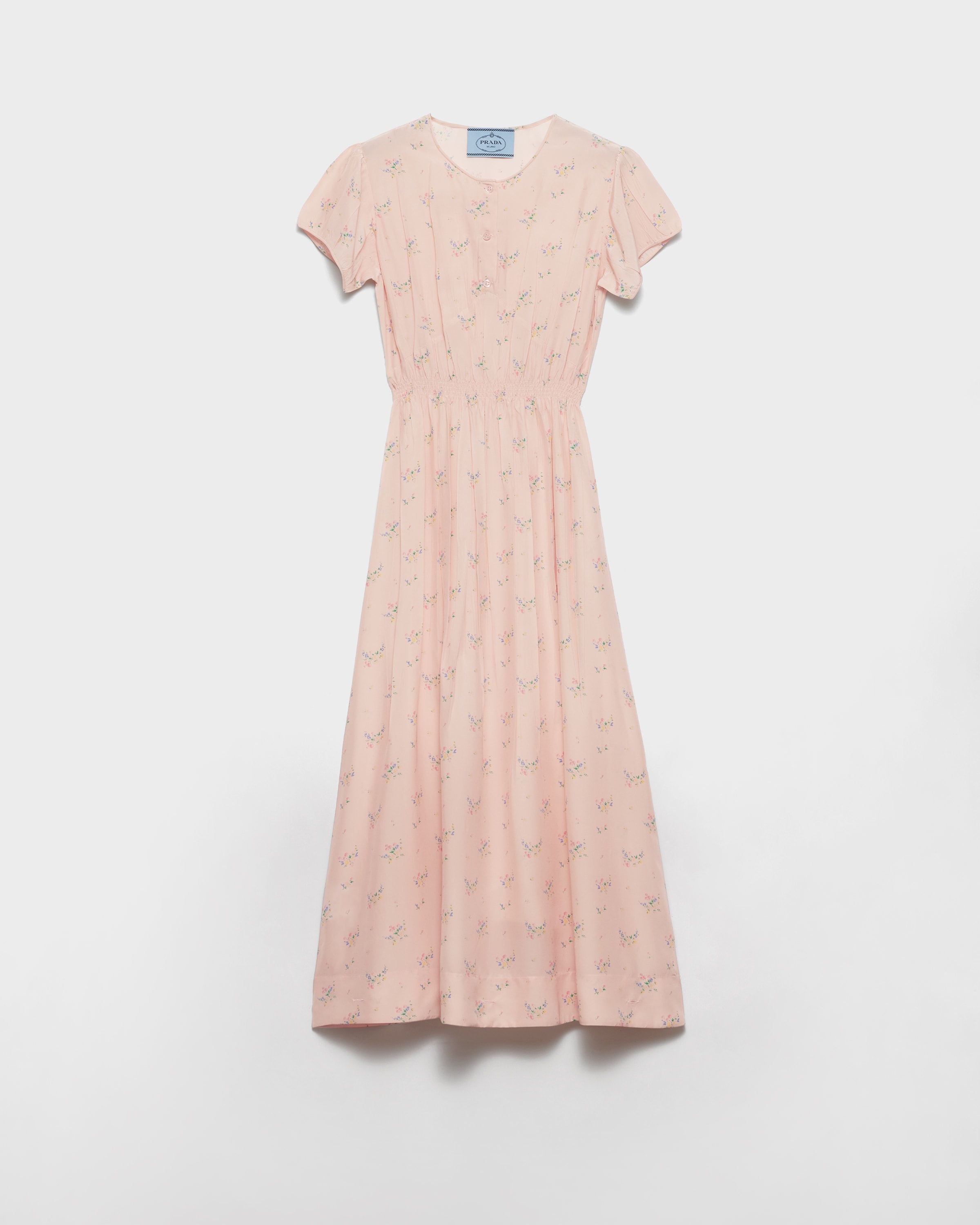 A delicate floral print enriches this light dress with a fit-and-flare silhouette featuring a skirt with softly flared lines. The design is characterized by a deliberately wrinkled effect, a distinctive detail of Prada collections. - Product code: P3Q10R_17OZ_F0924_S_OOO - Fit-and flare - Lined - Round neck with buttons - Side zipper closure - Short sleeves - Flared hem - Imported - The model is 181 cm tall and wears a size 38 Height: 120cm MATERIALS Main material: 38% silk 62% viscose