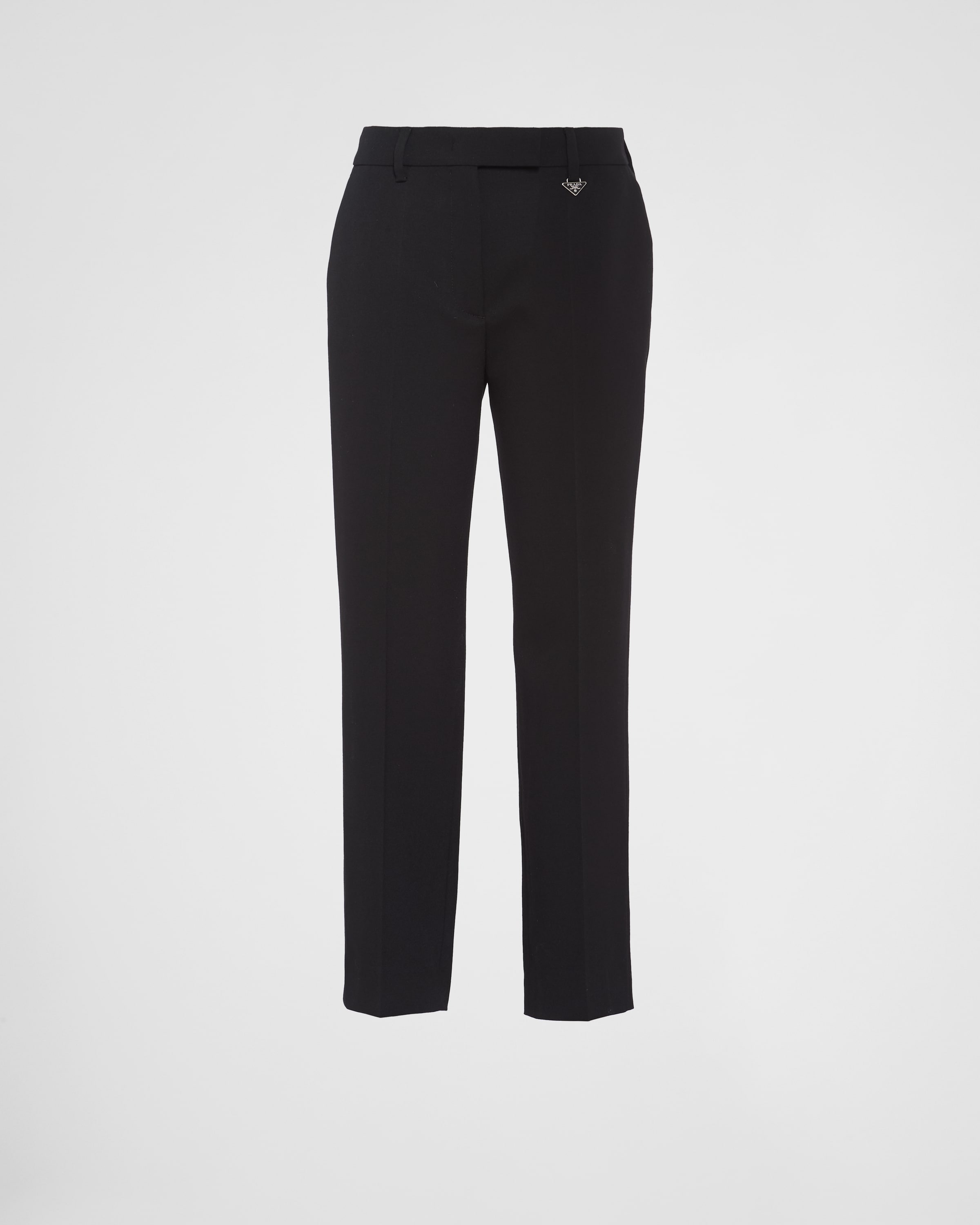 References to retro fashion blend rigor and modernism. These grain de poudre pants are characterized by the elegant, menswear fit. - Product code: P229H_13GY_F0002_S_232 - Menswear fit - Front closure - Enameled metal triangle logo - Diagonal front pockets and back welt pockets - Imported - The model is 178 cm tall and wears a size 38 Height: 32cm MATERIALS Main material: 2% elastane 98% virgin wool