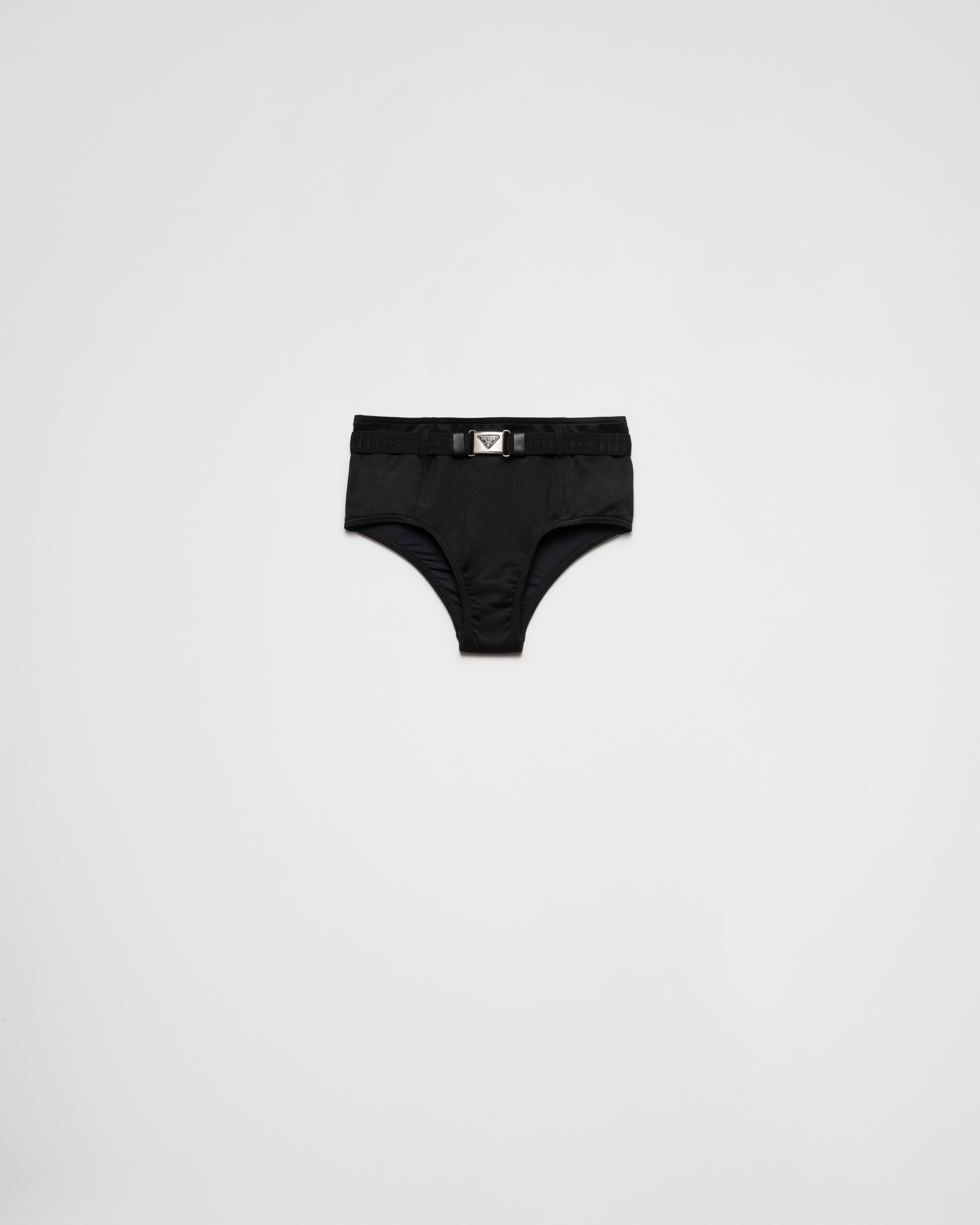 This bikini bottom made of interlock fabric has a high-waisted design with sleek lines, defined by a belt enriched with the triangle logo. - Product code: 70216_13SV_F0002_S_231 - Lined briefs - High-waisted fit - Removable belt with logo-engraved buckle - Imported - The model is 177 cm tall and wears a size 38 MATERIALS Main material: 10% elastane 90% recycled polyester