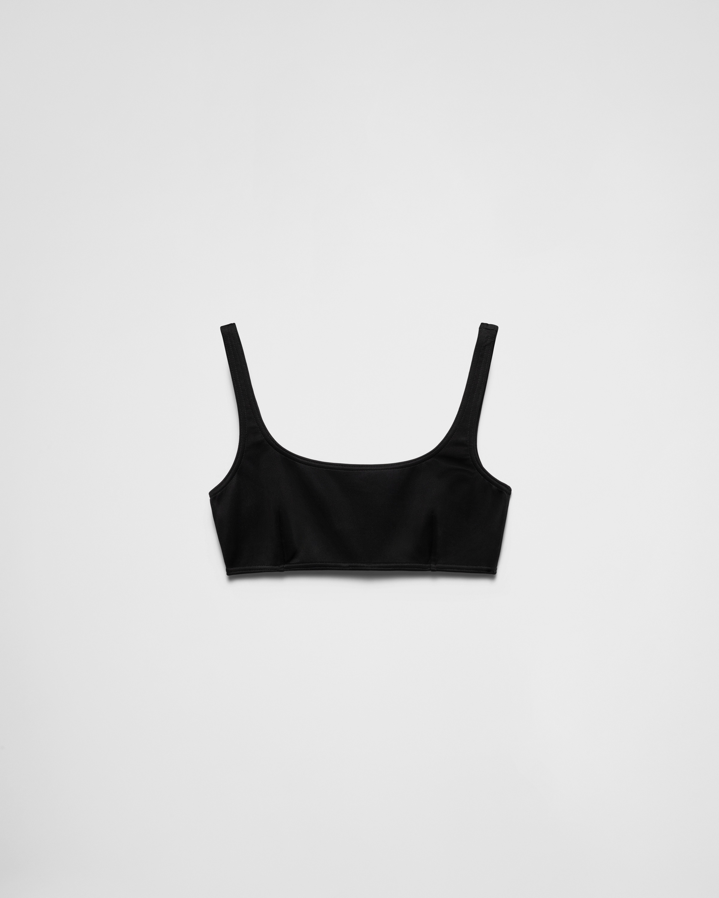 This bikini top made of interlock fabric has a contemporary design with sleek lines defined by the square neckline. For sustainable care to preserve the product's characteristics and reduce microfiber shedding, we recommend not washing the item too often. Let the product air out after every use and have it dry cleaned at a specialized ecological dry cleaners. - Product code: 70215_13SV_F0002_S_231 - Bralette - Lined - Imported - The model is 177 cm tall and wears a size 38 MATERIALS Main material: 10% elastane 90% recycled polyester