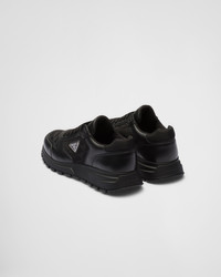 These high-top leather and nylon sneakers with a sporty design are characterized by the light expanded rubber sole and the screen-printed lettering logo. This product does not contribute to the SEA BEYOND educational program. - Product code: 2EE390_3LNW_F0002_F_G000 - Upper with nylon loops for laces - Enameled metal triangle logo on the upper and screen-printed Prada Milano logo on the tongue - Lightweight expanded rubber sole with lug tread - Sole height: 45 mm - Removable leather-covered insole - Imported MATERIALS Main material: Calfskin