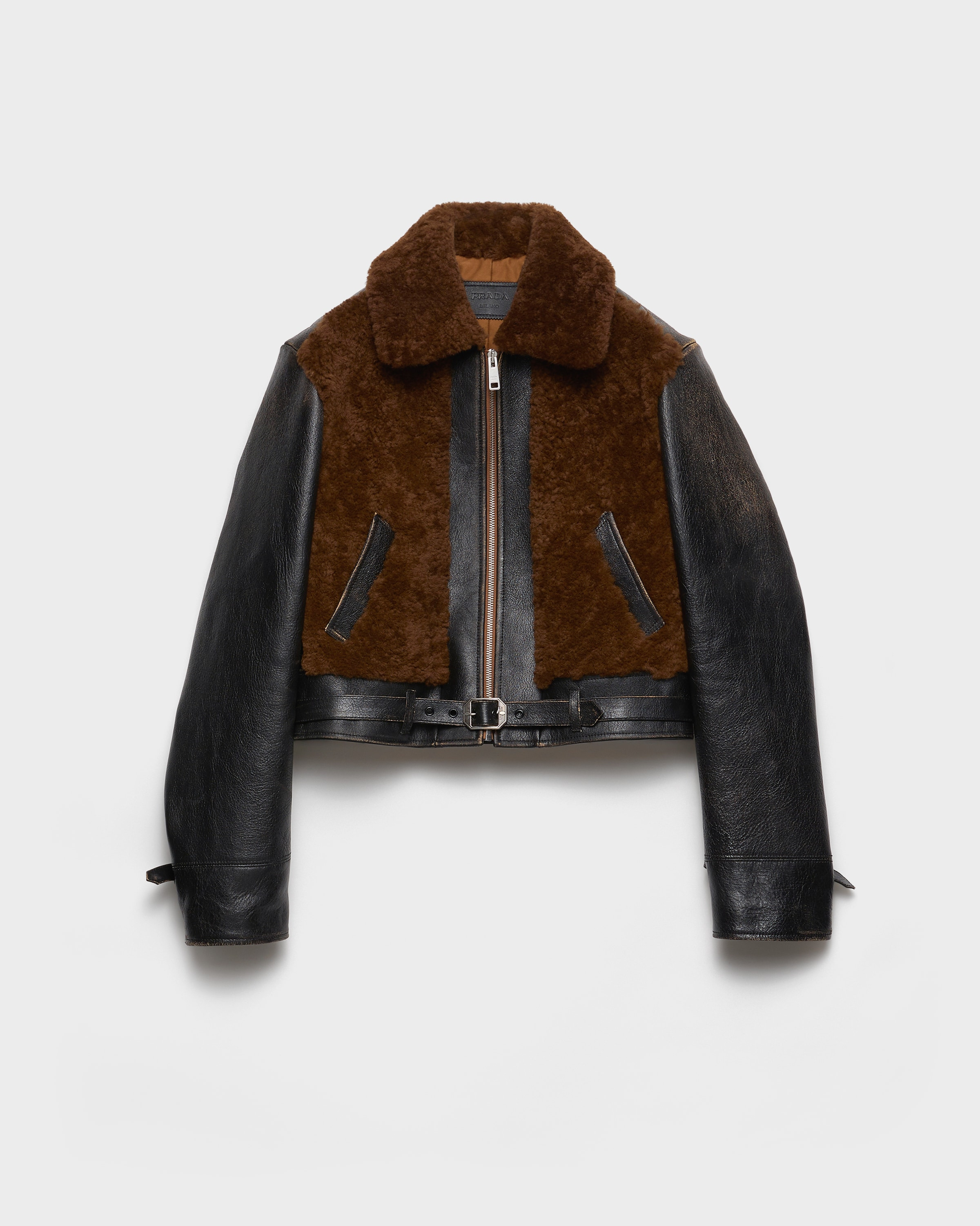 Prada reimagines the classic aviator jacket with updated details and vintage-inspired finishes. Crafted in leather with shearling inserts, the design is completed with the iconic triangle logo on the back. - Product code: 58A238_172N_F0807_S_OOO - Lined - Straight fit - Center zip closure - Shirt collar - Straight sleeves and cuffs, drawstring and buckle - Welt pockets - With belt - Leather triangle logo at center back - Vintage treatment - Imported - The model is 180 cm tall and wears a size 38 Height: 50cm MATERIALS Main material: Lambskin
