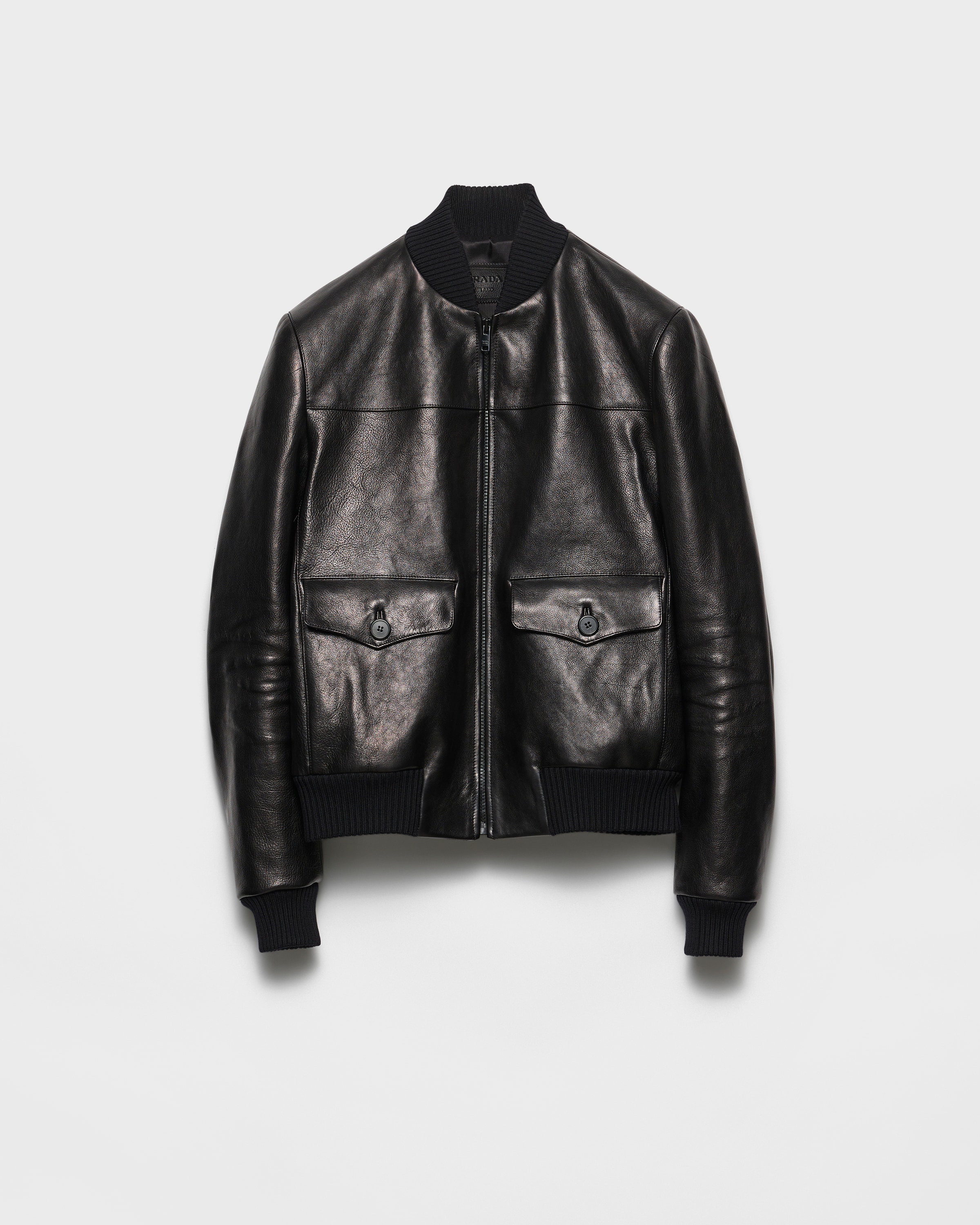 Soft volumes create the silhouette of this leather bomber jacket with refined style. The style, completed with knit details, embodies a distinctive and versatile style characterized by a combination of vintage references and contemporary touches. - Product code: UPW580_17UA_F0002_S_OOO - Lined garment - Regular fit - Zipper closure - Knit collar - Straight sleeves and knit cuffs - Pockets with flap and button - Hem with knit trim - Leather triangle logo on the back - Final waxing treatment - Imported - The model is 189 cm tall and wears a size 48 Height: 60cm MATERIALS Main material: Buffalo