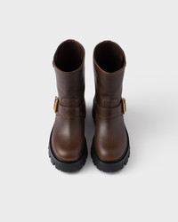A design with refined lines and artisan construction defines these booties made of leather with a vintage finish. The distinctive metal buckle adds character to biker style, completed with chunky rubber soles. - Product code: 1U187O_DFW_F0324_F_050 - Upper with logo-engraved metal buckle - Leather lining - Enameled metal triangle logo - Boot leg: 19 cm - Monoblock rubber sole, 50 mm, with hot-stamped logo - Lug tread - Imported MATERIALS Main material: Calfskin