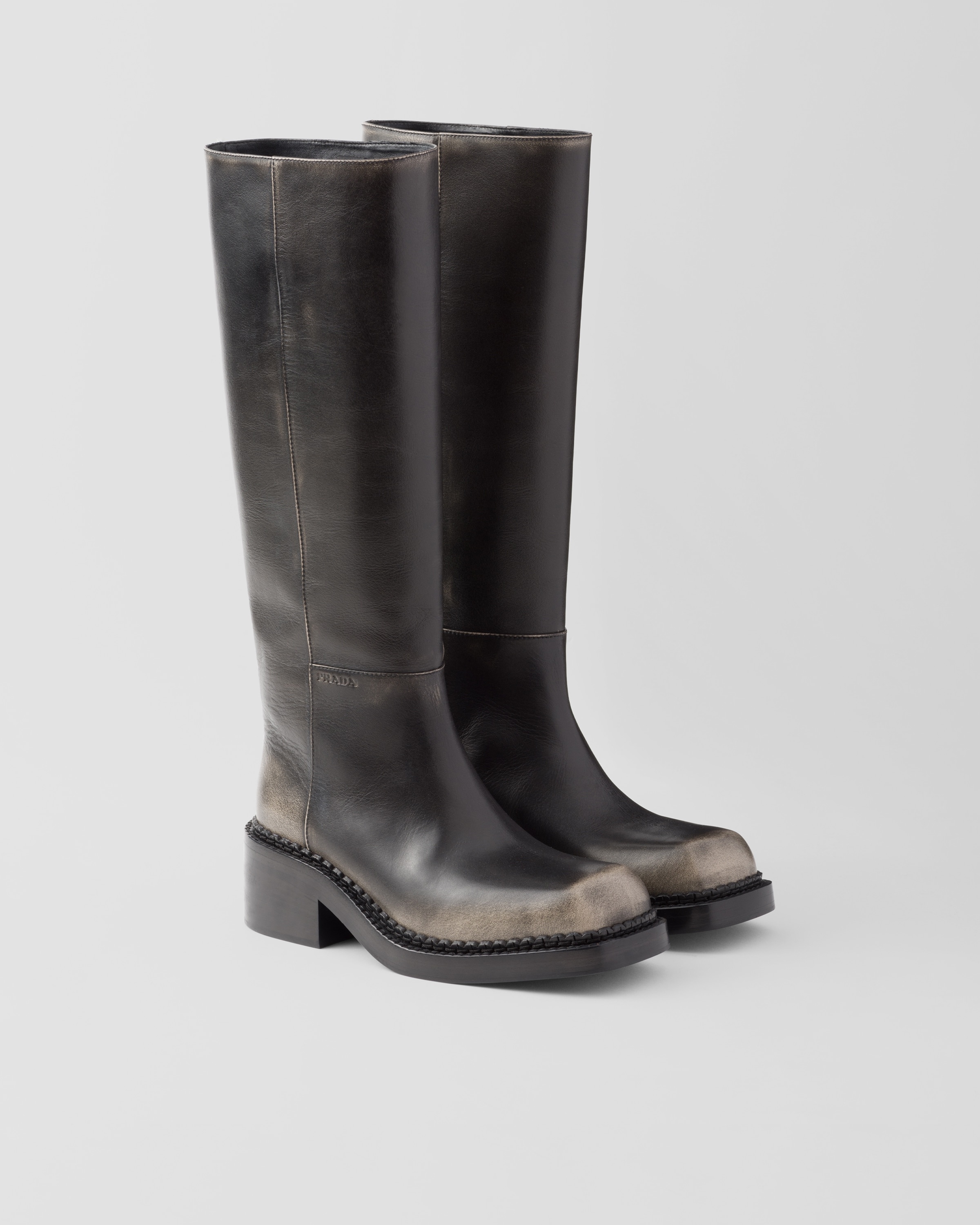 A combination of retro details and contemporary lines defines the silhouette of these leather boots with an aged effect, an expression of a dual aesthetic that blurs the boundaries between past and present. - Product code: 1W746N_3F33_F0002_F_D055 - Leather lining - Hot-stamped logo - Boot leg: 39 cm - Leather and monoblock rubber sole with hot-stamped logo - Heel height 55 mm - Imported MATERIALS Main material: Calfskin