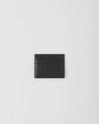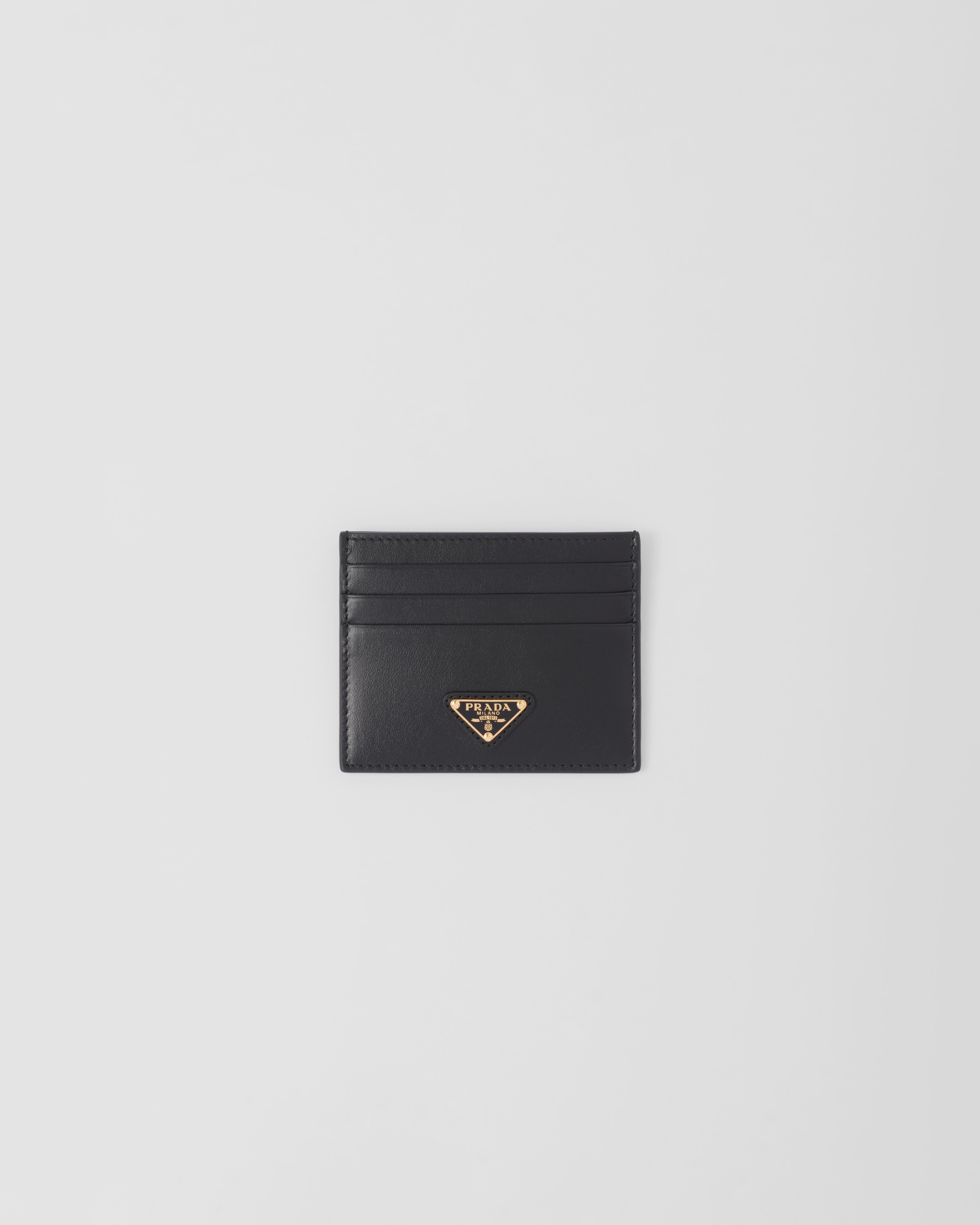 This leather card holder with six external slots and a practical internal pocket has a sleek and sophisticated design. The accessory is completed by the iconic signature of the enameled metal triangle logo. - Product code: 1MC025_2CNP_F0002 - Enameled metal triangle logo - Six card slots - One internal pocket - Imported Height: 8cm Width: 10cm MATERIALS Main material: Calfskin