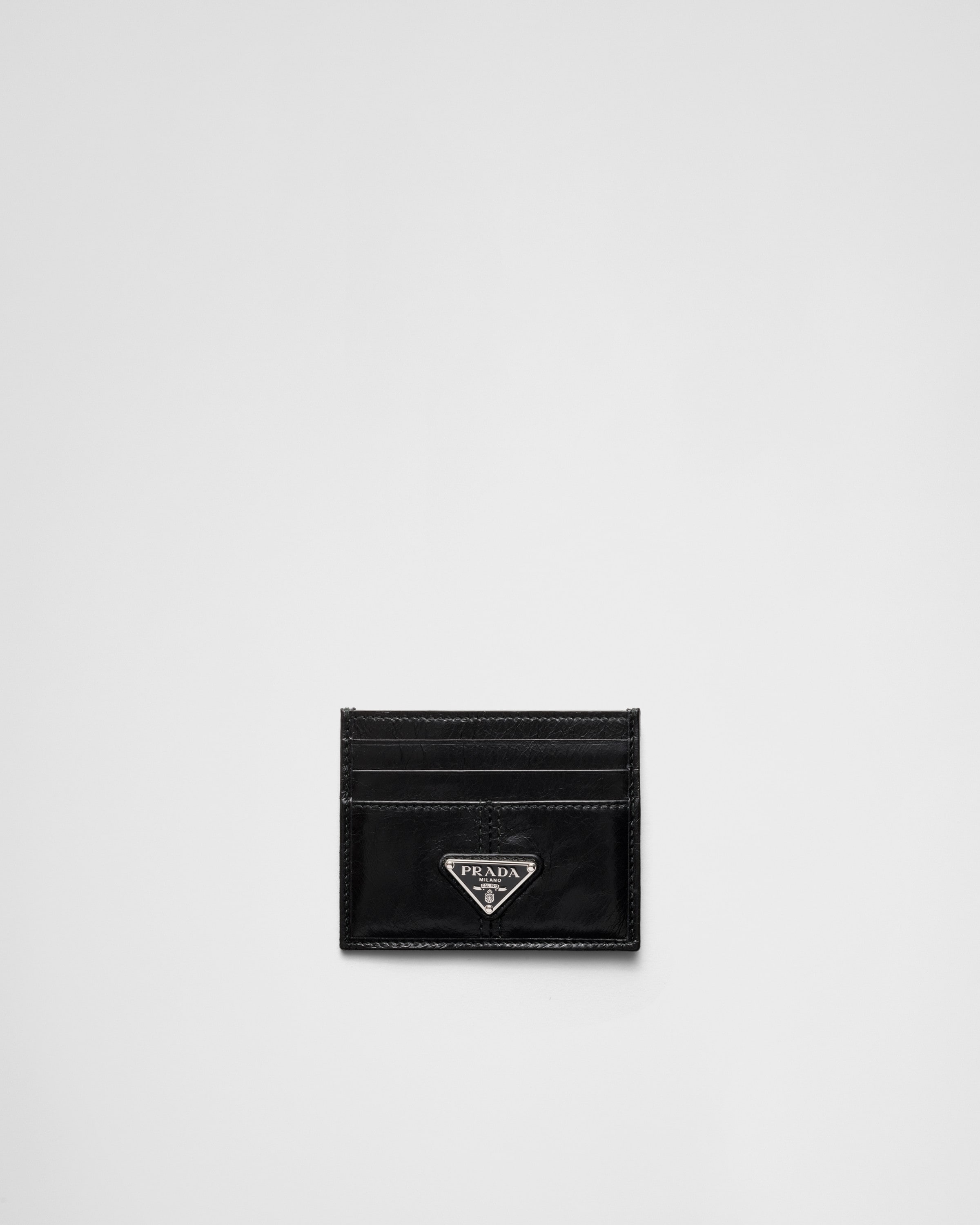 Sleek lines and iconic geometric shapes define this card holder made of leather with an elegant shiny finish that gives the accessory a modern, sophisticated character. - Product code: 2MC025_2CX7_F0002 - Enameled metal triangle logo - Six card slots - Internal pocket - Moire and leather lining - Imported Height: 8cm Width: 10cm MATERIALS Main material: Calfskin