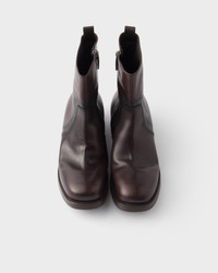 Sleek lines and contemporary style define these boots. Fine leather and Prada details express authentic, refined elegance. - Product code: 1U276O_3K1U_F0003_F_040 - Upper with pull tab on the back - Leather lining - Screen-printed logo - Side zipper closure - Boot leg: 18 cm - Leather and monoblock rubber sole with hot-stamped logo - Heel height: 40 mm - Imported MATERIALS Main material: Calfskin