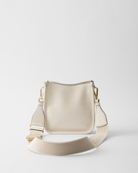 This versatile leather bag boasts a sleek and functional design. The shoulder strap adds a sporty element to the accessory, elevated by the metal logo lettering that stands out on the simple yet distinctive geometry of the iconic triangle. - Product code: 1BH191_2DKV_F02EU_V_7NO - Adjustable and detachable logo-print woven tape shoulder strap, length 95 cm. Maximum length 107 cm - Minimum length 56 cm - Maximum drop 60 cm - Minimum drop 40 cm - Detachable, adjustable leather shoulder strap, length: 100 cm - Metal hardware - Metal lettering logo on the front - Magnetic flap closure - Logo-print nylon lining with card slots - Imported Height: 20cm Width: 19cm Length: 6cm MATERIALS Main material: Calfskin
