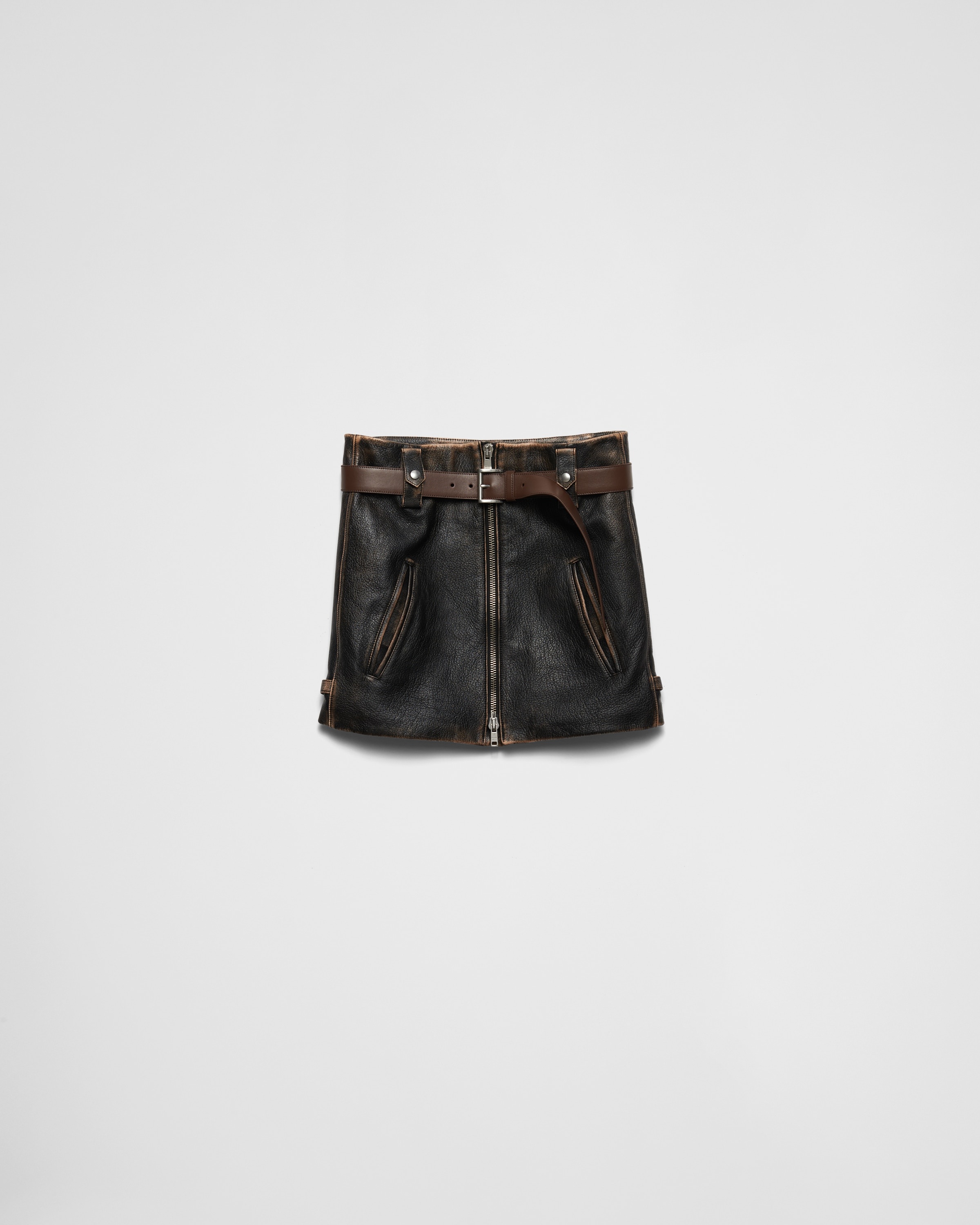 This leather miniskirt reinterpreted with contemporary details has a refined, hybrid silhouette. The belt with a sleek design enriches the straight style made with an artisan process that gives the garment a unique aged finish. - Product code: 51880_1455_F0002_S_OOO - Lined - Regular fit - Zipper fly and belt - Welt pockets - Vintage treatment - Straps with buckles on the back - Imported - The model is 180 cm tall and wears a size 38 Height: 40cm MATERIALS Main material: Goatskin