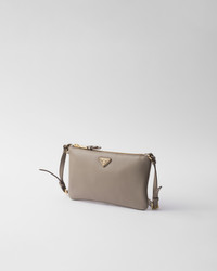With its geometric shape, this leather pouch blends modern elegance and functionality. - Product code: 1BC238_2CYS_F0572_V_OVO - Zipper closure--Enameled metal triangle logo--Adjustable leather handle--Logo-print nylon lining with zipper pocket - Imported Height: 14cm Width: 24.5cm MATERIALS Main material: Calfskin